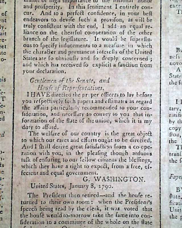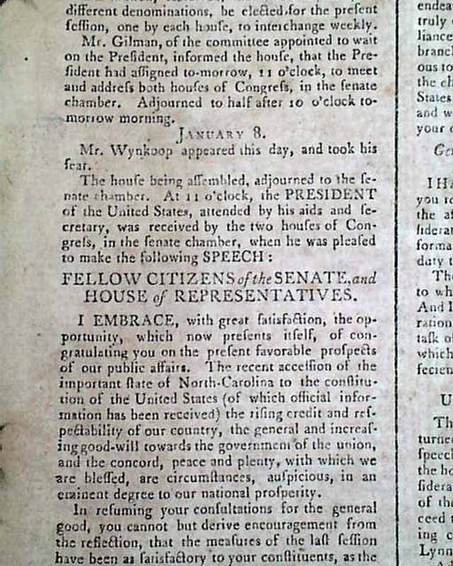 Hereafter is the text of George Washington's first Annual Message to Congress on the State of the Union (see). The message, which is relatively short, is signed in type: G. Washington. There is additional text concerning the final business of the day that says: "The President then retired--and the house returned to their own room: when the President's speech being read by the clerk..." & a bit more. And from "January 9" is the business of the following day.