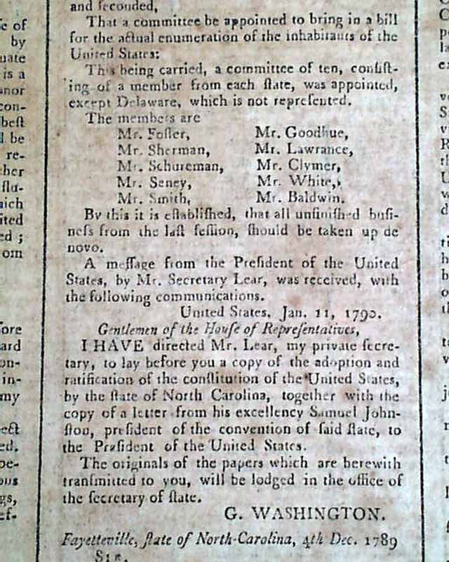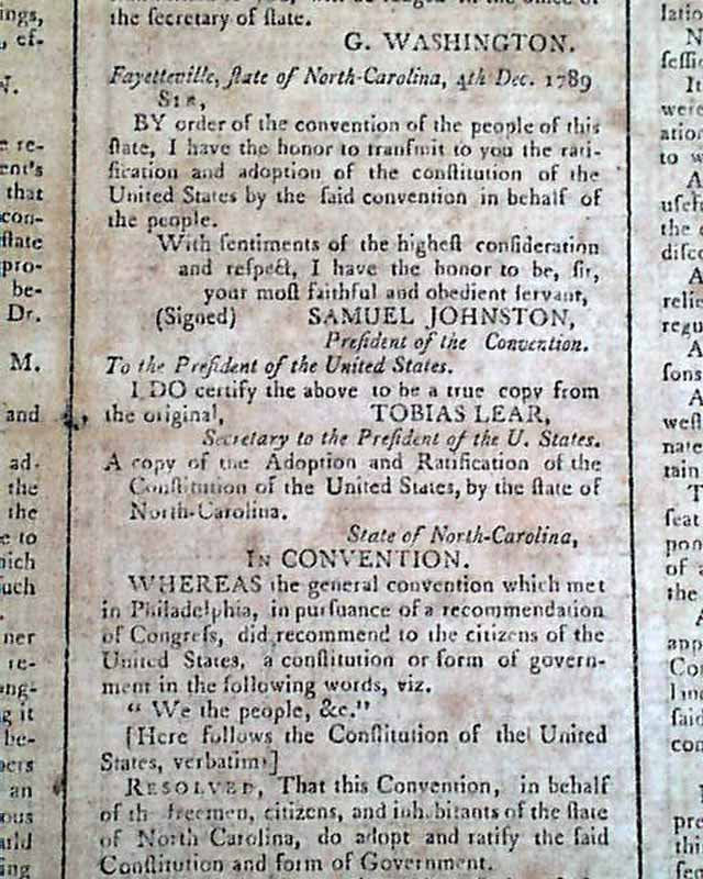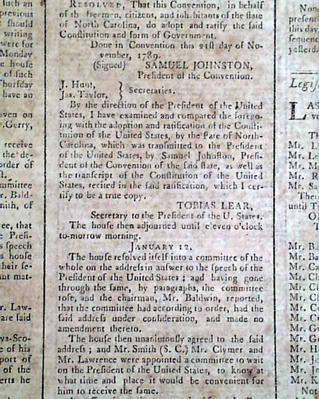 In the next column is a message from the President stating that he directed his private secretary, Mr. Lear, to lay before the House a copy of the adoption and ratification of the Constitution by the state of North Carolina, along with a letter from Samuel Johnson, the Secretary of the State Convention, signed in type: G. Washington.