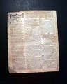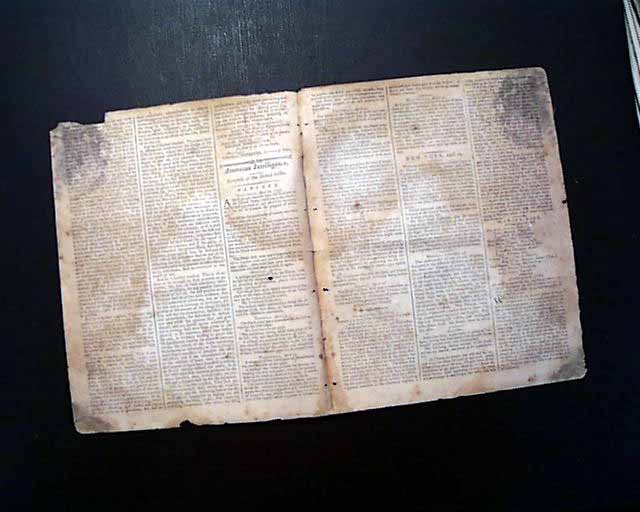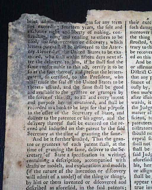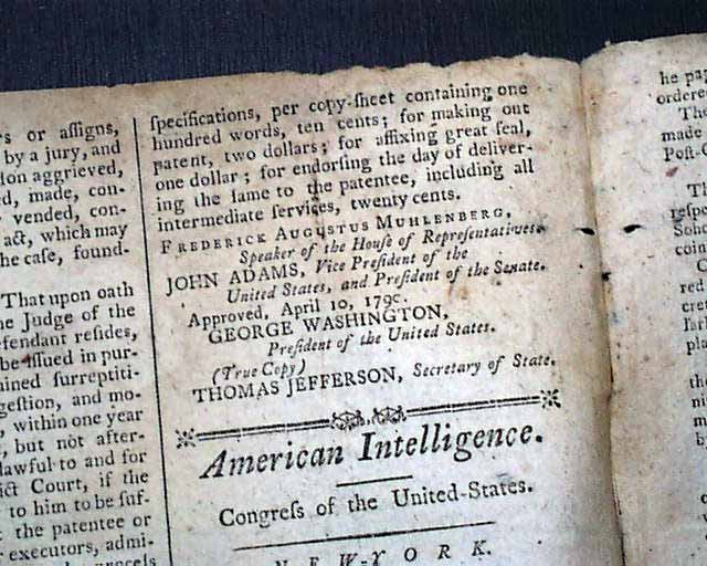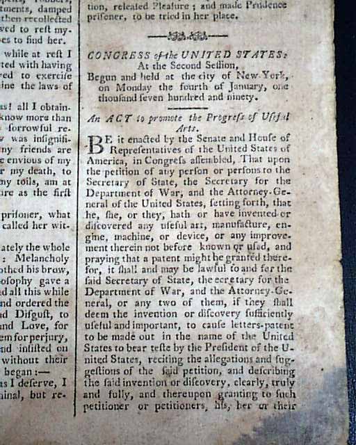 Great to have this historic document in a New York newspaper where the capital was in 1790, and also beginning on the front page. Some staining near the right edge does not cause loss of readability, small piece from the top margin causes loss to parts of 3 words in the Patent Act (see), light damp staining.