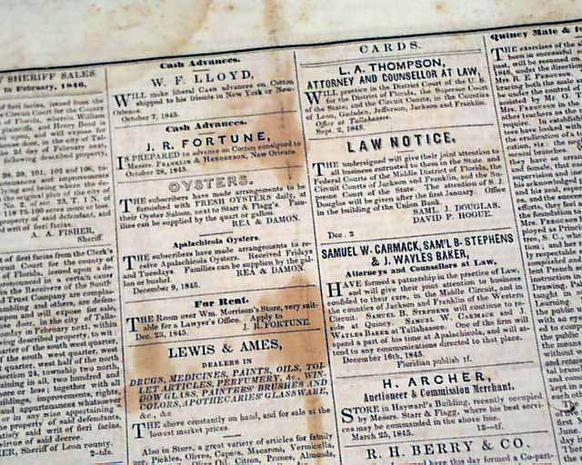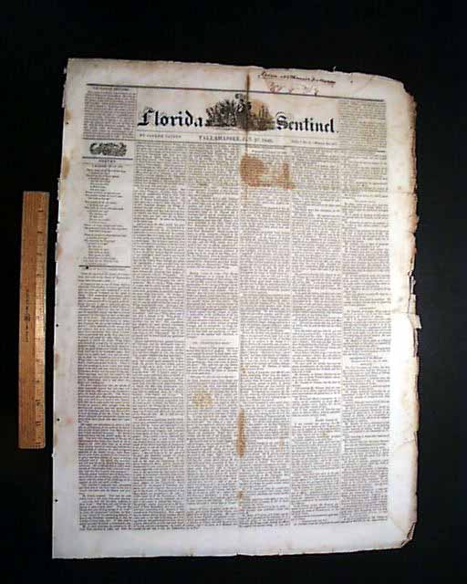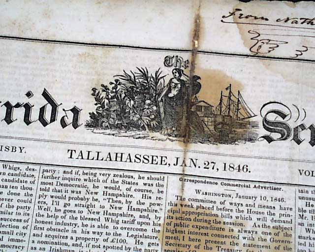FLORIDA SENTINEL, Tallahassee, Florida, Jan. 27, 1846 A very early newspaper from the capital of Florida, and with a nice engraving in the masthead. This newspaper is formatted much like most newspapers of the day, being complete in four pages with various local and national news reports in addition to many advertisements. This issue is among the very last two issues we have in our inventory.