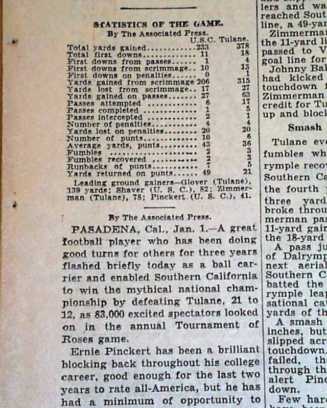 This 26 page newspaper has a banner headline on page 15: "83,000 See Southern California Defeat Tulane, 21 to 12, in Rose Bowl Game" with subheads, stats and lineup. Lots of text, too much to photograph.