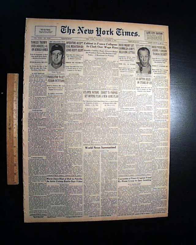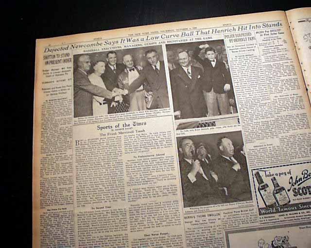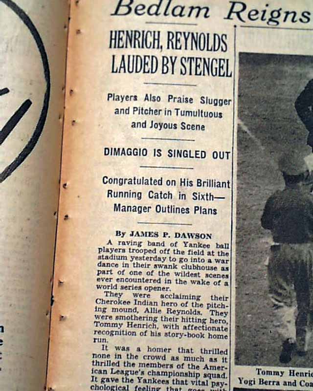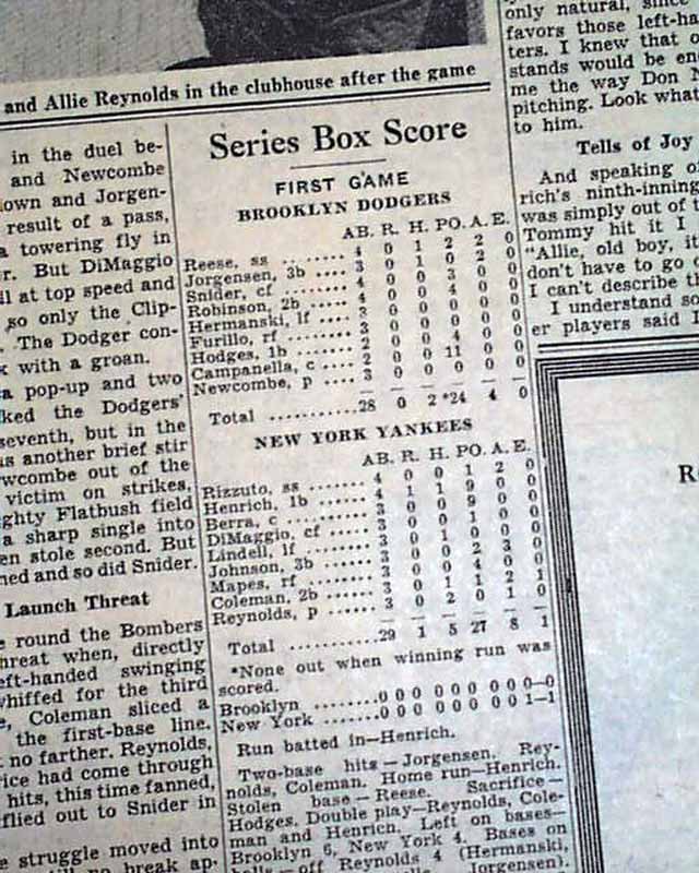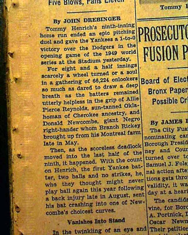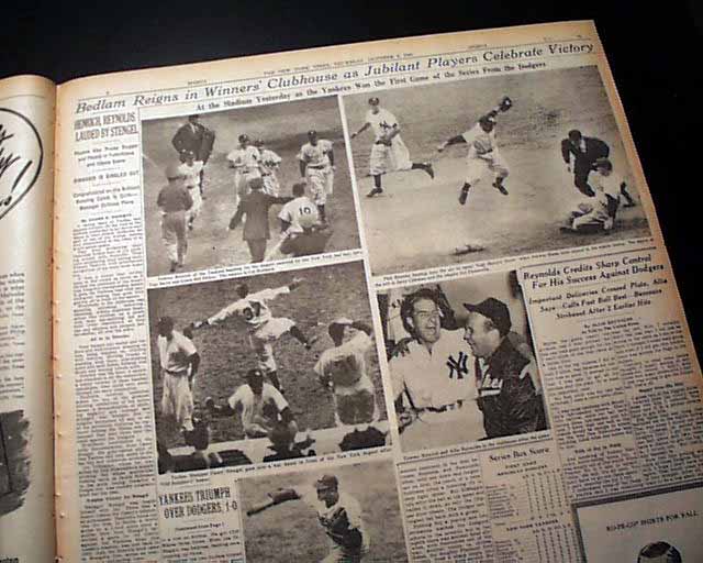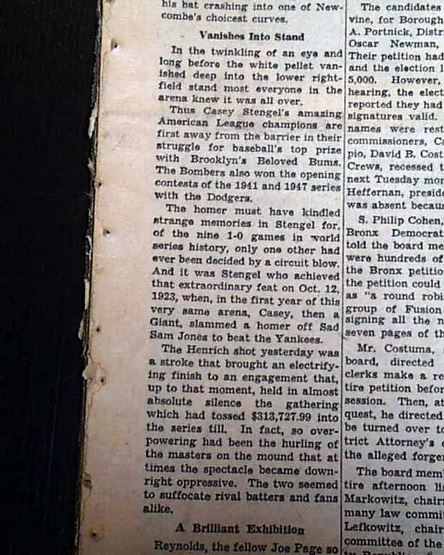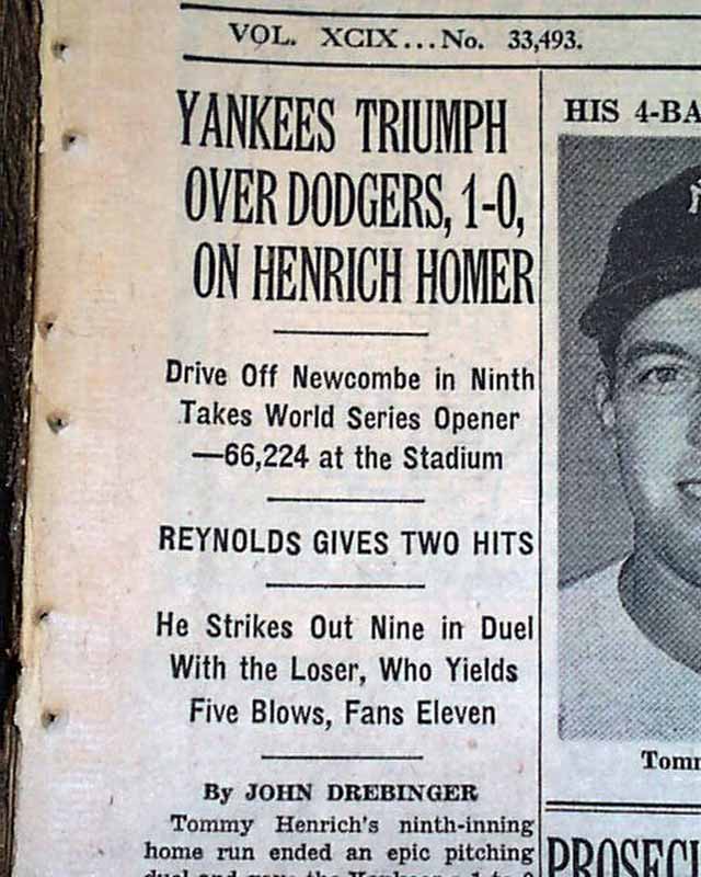 This 64 page newspaper has one column headlines on the front page that include: "YANKEES TRIUMPH OVER DODGERS, 1-0, ON HENRICH HOMER", "Drive Off Newcombe in Ninth Takes World Series Opener" and more with photo of Henrich. (see)