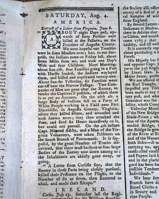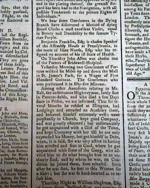 Page 3 has a report headed: "America" with reports of troubles with Indians in Virginia (see), but the more interesting item is the page 2 mention that: "Benjamin Franklin, Esq. is chosen Speaker of the Assembly House at Pennsylvania, in the room of Isaac Norris, Esq. who has resigned on account of his ill state of health." (see) Unusual to find such political mentions of Franklin from so long before the Revolutionary War.