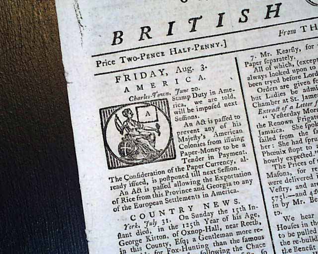 The top of the ftpg. has a brief yet historically very significant item: "Stamp Duty in America, we are told, will be imposed next sessions. An Act is passed to prevent any of his Majesty's American Colonies from issuing paper money to be a tender in payment...is postponed till next session."