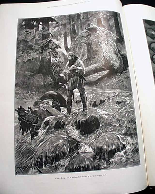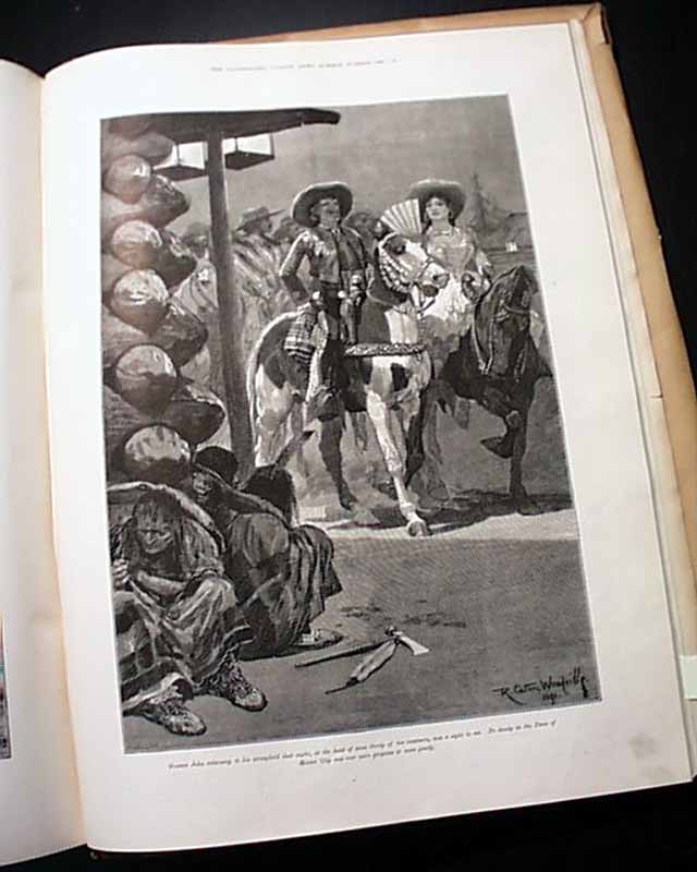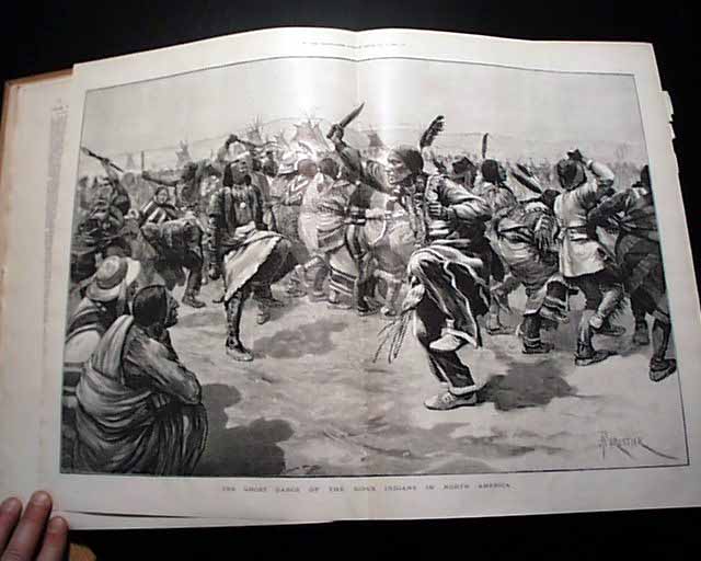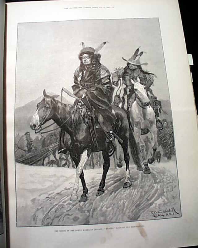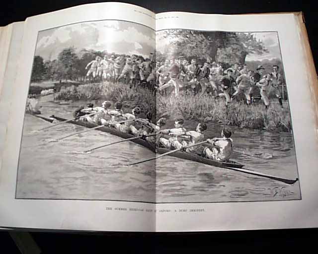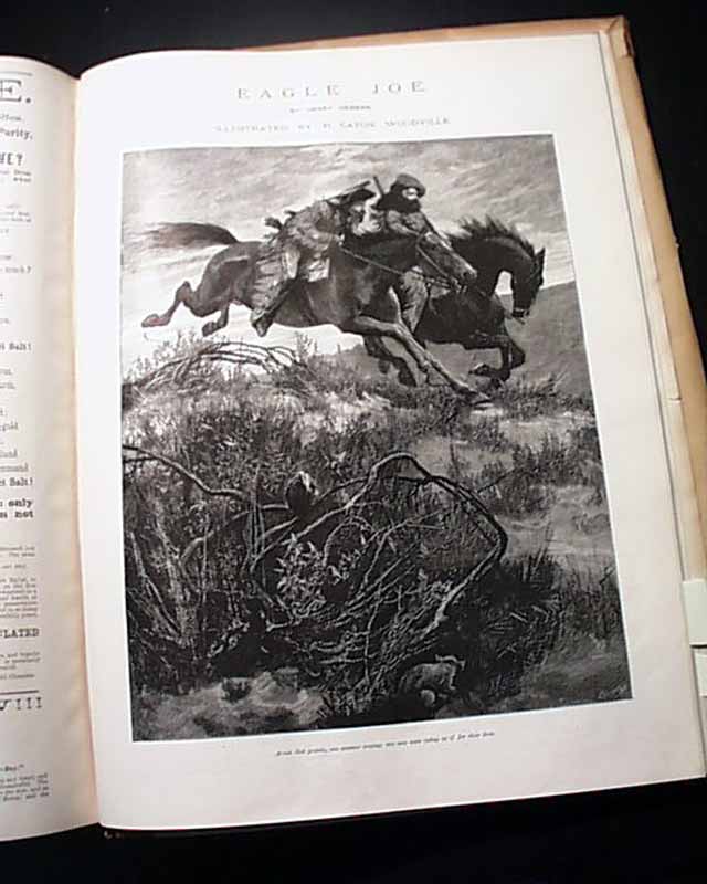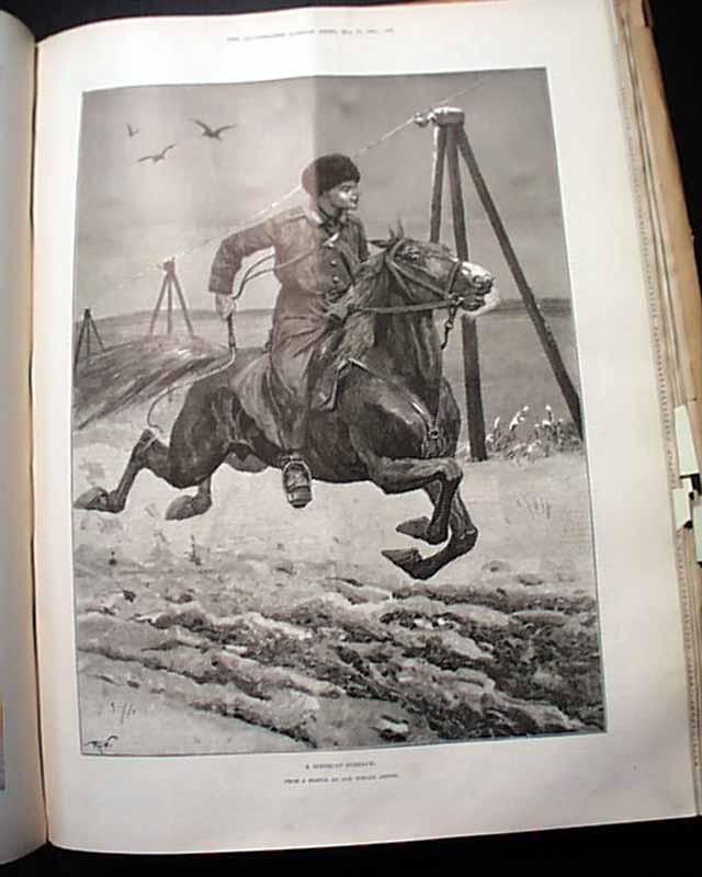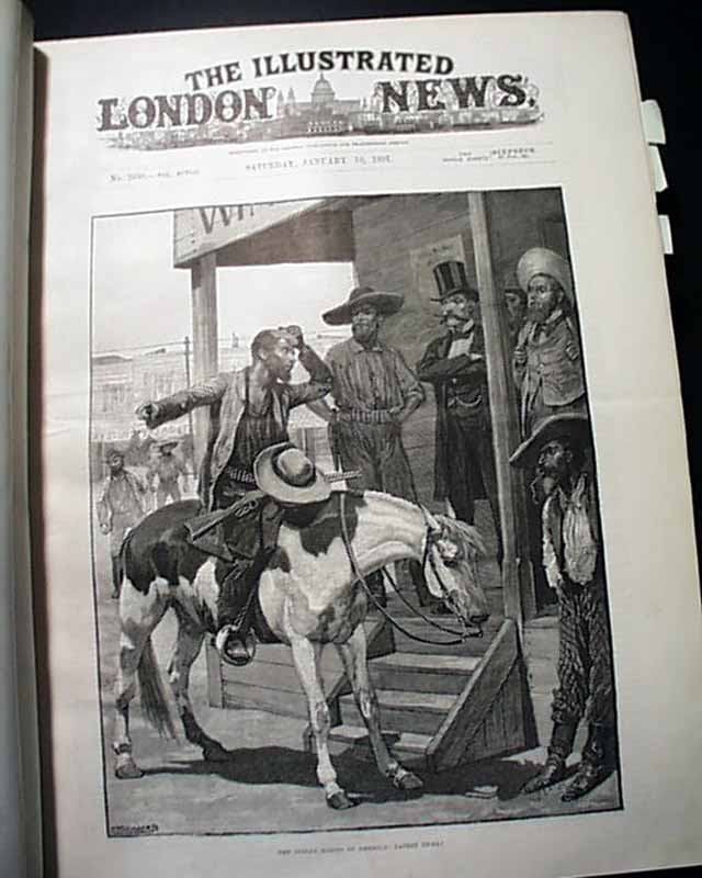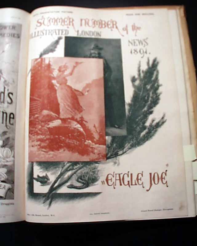Some of the prints include: "Skating Match at Littleport" showing ice skating; "Tobogganing in Surrey" "Shopping In New York on New Year's Eve"; a terrific doublepage centerfold: "The Ghost Dance of the Sioiux Indians In North America"; a nice cowboy scene from a Western town: "The Indian Rising in America--Latest News!"; a large number of prints of Siberia; "Views in Alaska & on the Coasts of the Behring Sea" has 8 scenes; "The Rising of the North American Indians: 'Braves' Leaving the Reservation" is an Indian scene; "Sketches in Chili,South America"; several prints of the Salvation Army; "The Great Schools of England--Winchester"; a fullpg. print of "Sir Walter Scott" "Quicksilver Mining in Mexico" "Views In Iceland" "The Late General W. T. Sherman" "Sketches at Monte Carlo" "A Lecture of Fencing at the Lyceum Theatre" "Football Match between England & Scotland..." (rugby); "the Universities' Boat Race 'Are You Ready?' "Football Association Challenge Cup Match..." (soccer); a small print of: "The Late Mr. P. T. Barnum"; four full page prints of: "Middlesborough, Kentucky" "The First Day of the Season" shows a woman with a tennis racket; scenes in New Zealand; "The Derby: The Fall of the Flag" "The Great Schools of England: Rugby" "Ascot Races..." "William Makepeace Thackeray"; a nice color cover of the: "Summer Number of the Illustrated London News, 1891 - Eagle Joe" (see), and so much more!