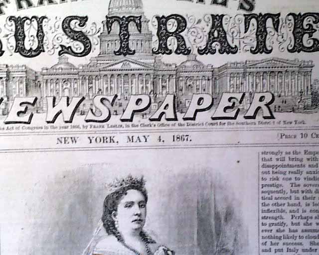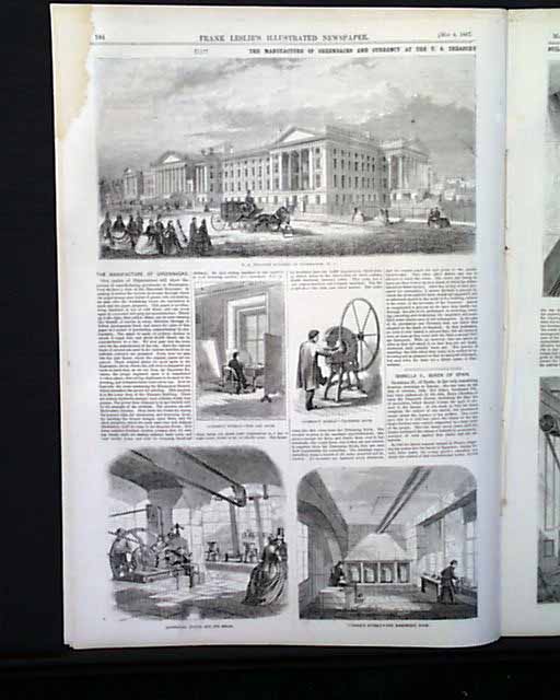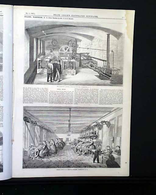 LESLIE'S ILLUSTRATED, from New York, dated May 4, 1867 Inside the issue is a one page report: "The Manufacture Of Greenbacks and Currency At The U.S. Treasury Building". which has a nice view of the exterior of the Treasury Building, plus four smaller scenes of work areas, and on the opposite page large illustration of the "Hydraulic Engines" and one of the Sealing Room".