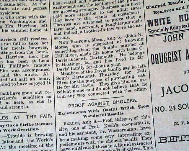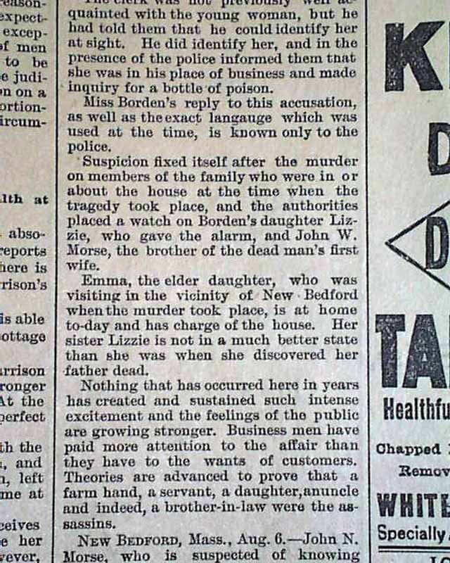 This 4 page newspaper has one column headlines on page 2: "FALL RIVER'S MYSTERY" "Police Believe They Have an Important Clue" "One Of The Girls Bought Poison" "Lizzie, the Younger Daughter, Identified by the Drug Clerk...."
