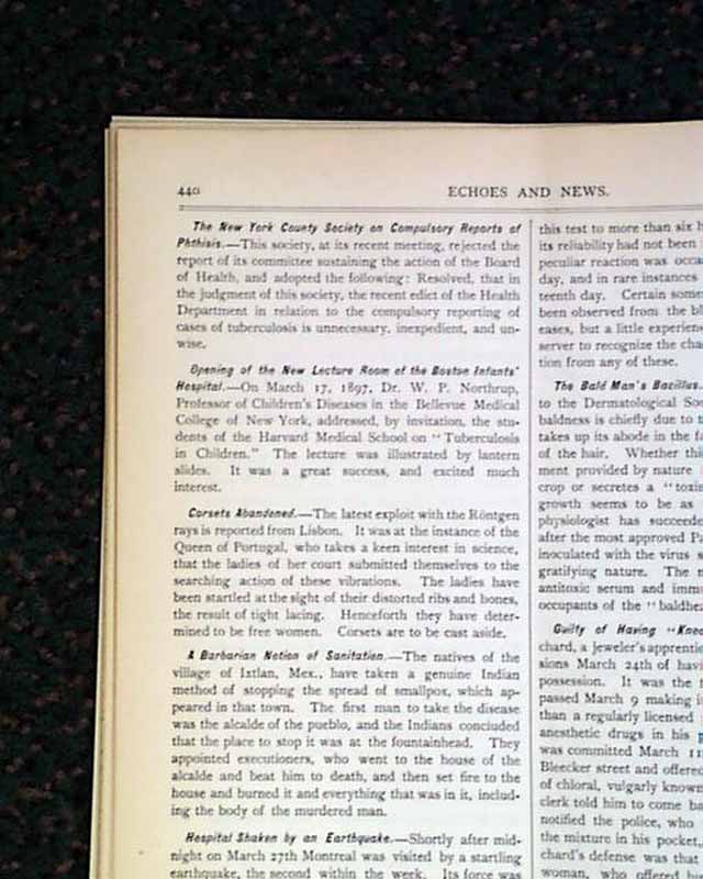An interesting 28+ page "Weekly Journal of Medical Science" for doctors or anyone in the medical profession, filled with various reports, technical articles, and a few medical-related advertisements. Each issue also contains a couple of illustrations (see images for examples) as well. Measures about 7 by 10 inches. Good condition, but some dirtiness is to be expected. The issue you will receive will be of the same look and condition as the one shown, but actual dates will vary within the time span indicated.