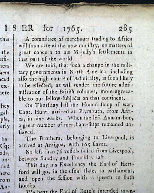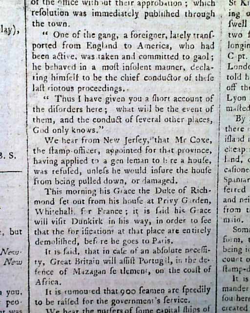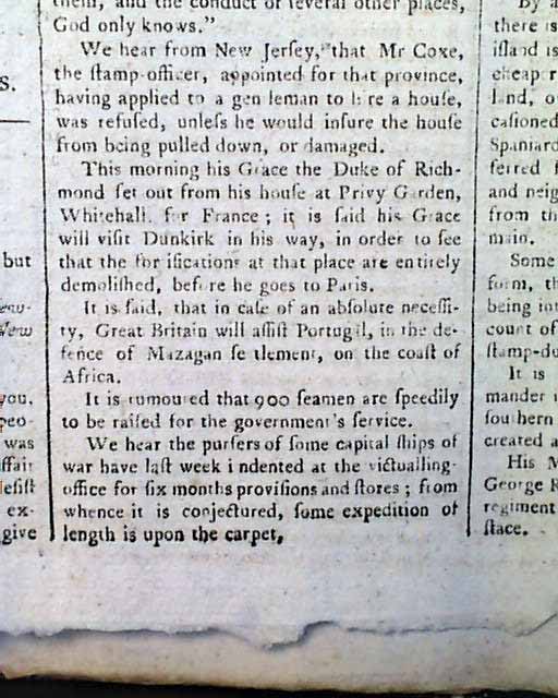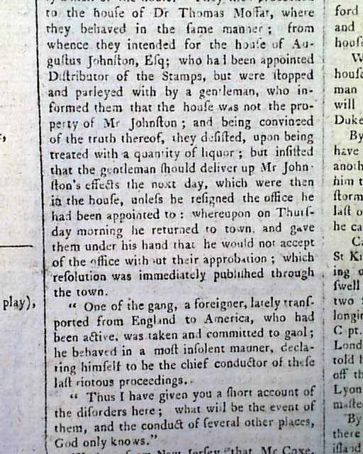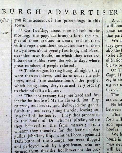 An inside page has an excellent & detailed account of the protest against the Rhode Island tax distributor & two others, the text including: "...On Tuesday, about nine o'clock in the morning, the populace brought forth the effigies of three persons in a cart, each of them with a rope about their necks, and carried them to a gallows... on which they were exhibited to public view the whole day,... These effigies having hung till night, they were then cut down, and burnt under the gallows, amidst the acclamations of the people, which being done, they returned very orderly to their respective...The next evening they mustered & beset the house of Martin Howard, Jr. & broke & destroyed the goods, furniture & every thing therein...They then proceeded to the house of Dr. Thomas Moffat where they behaved in the same manner; from whence they intended for the house of Augustus Johnson, Esq., who had been appointed Distributor of the Stamps..." with more (see photos). See Wikipedia for further information on this action by the Sons of Liberty.