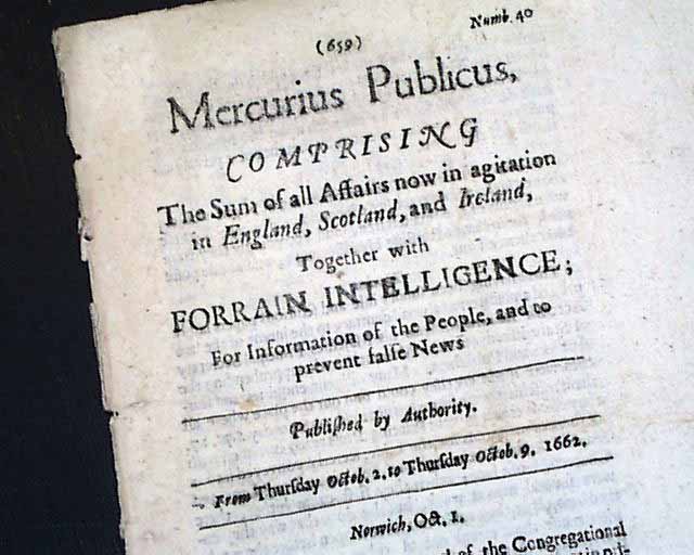 MERCURIUS PUBLICUS, London, England, October 9, 1662 Here is an uncommon title in newsbook format (the forerunner of newspapers) "Comprising the sum of all Affairs now in agitation in England, Scotland, and Ireland, Together with Forrain Intelligence For Information of the People, & to Prevent false News" as stated in the masthead. (see photos)