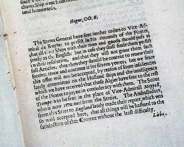 The entire issue is taken up with various reports from all corners of Europe, much of it having a military theme. One item from the "Hague" notes: "The States General have sent further orders to Vice Admiral de Ruyter to persist in his demands of the Pirates, that all their ships with their men & goods should pass as freely as the English..." (see). There are several advertisements as well.