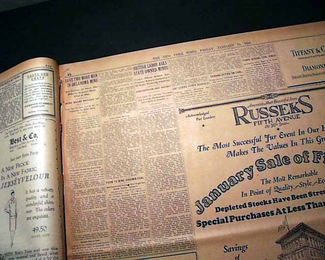 THE NEW YORK TIMES, New York, January 15, 1926 This 44 page newspaper has one column headlines on page 5 that include: "SAVE TWO MORE MEN IN OKLAHOMA MINE" "One Crawled 23 Hours After Wilburton Explosion Which Killed 91 Men" "MORE BODIES BROUGHT UP" and more. (see)