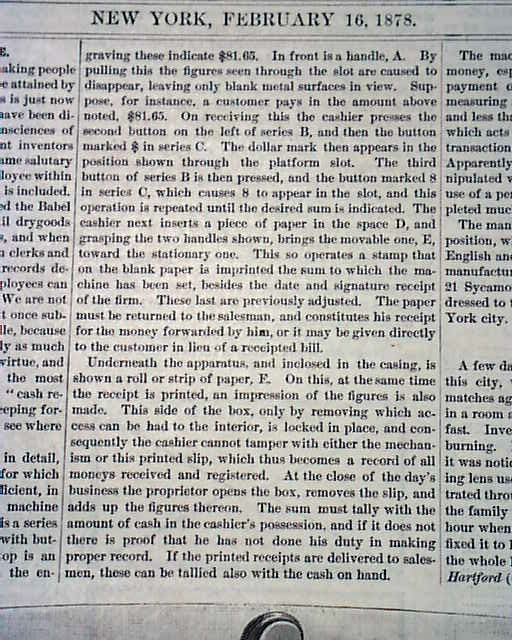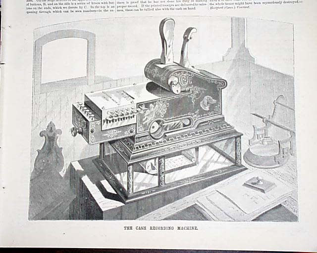 wikipedia notes: The first cash register was invented by James Ritty following the American Civil War. He was the owner of a saloon in Dayton, Ohio, USA, and wanted to stop employees from pilfering his profits. He invented the Ritty Model I [1]in 1879 after seeing a tool that counted the revolutions of the propeller on a steamship. With the help of John Ritty, his brother, he patented it in 1883.[1]