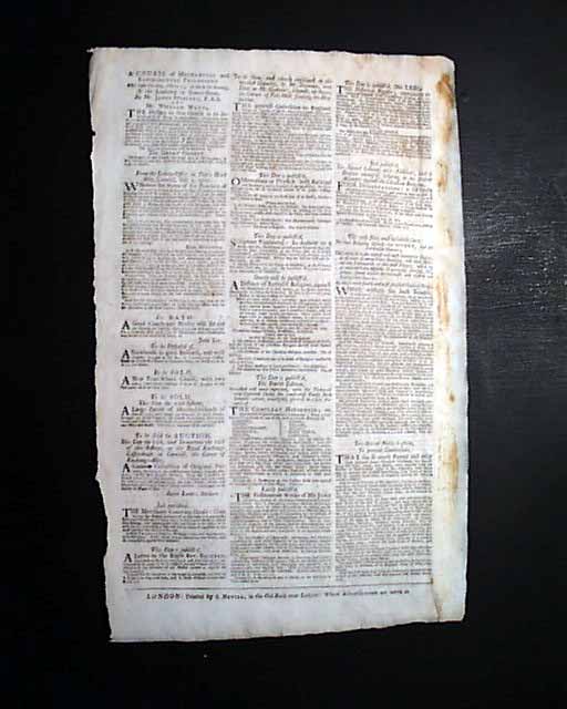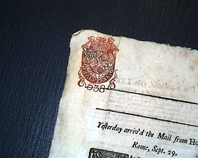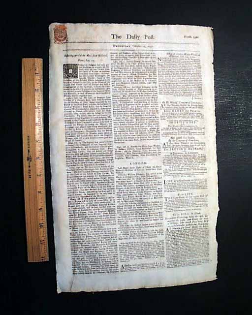 THE DAILY POST, London, Oct. 13, 1731  A very uncommon folio size single sheet newspaper, with a darkly inked, full red tax stamp in the upper left corner (see). The ftpg. has various news reports and a few ads, while the back page is entirely taken up with ads. In very nice, untrimmed condition with a bit of staining to a back page margin.