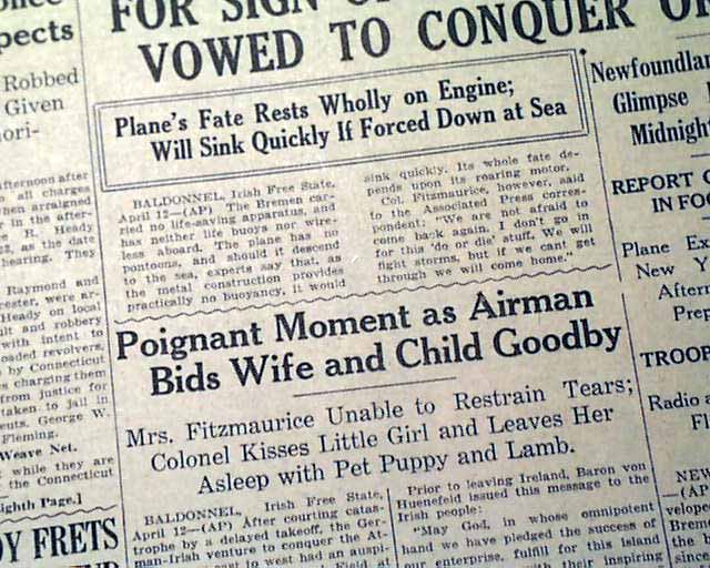 THE SPRINGFIELD UNION, Springfield, Massachusetts, April 13, 1928 This 32 page newspaper has a three column headline on the front page: