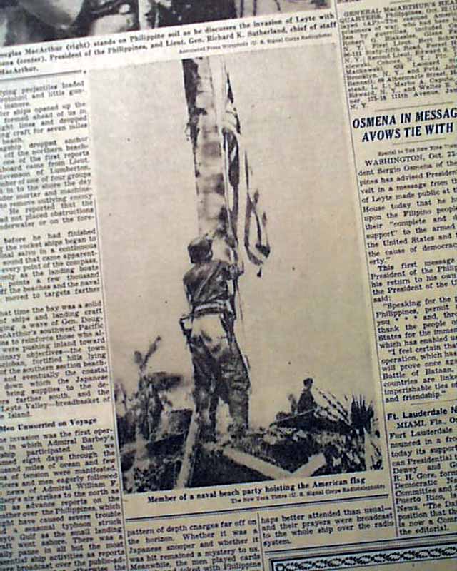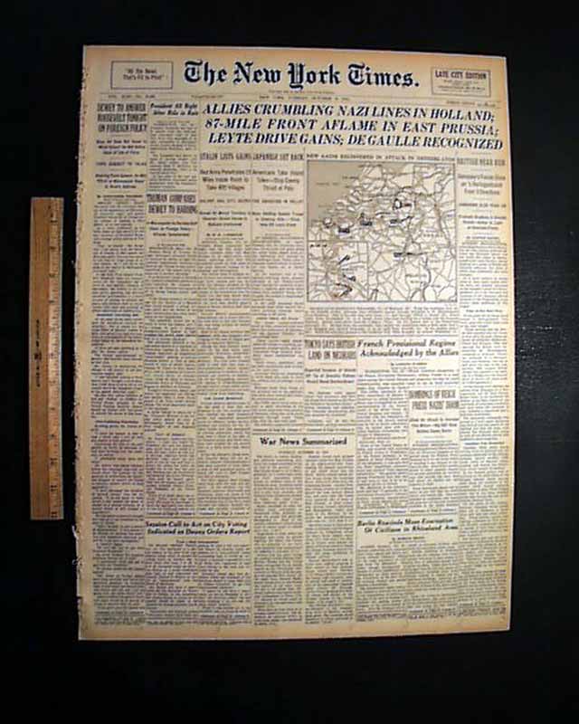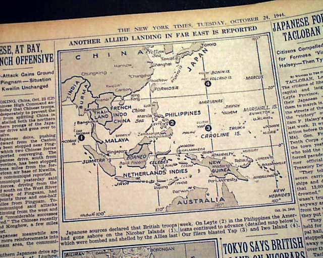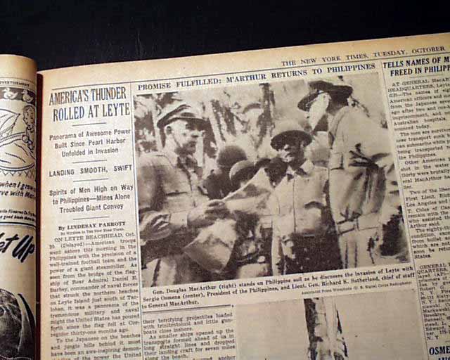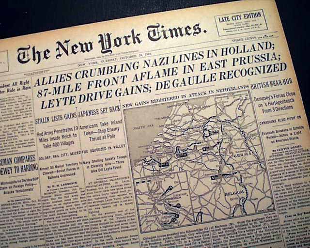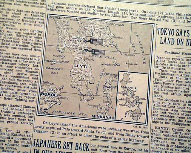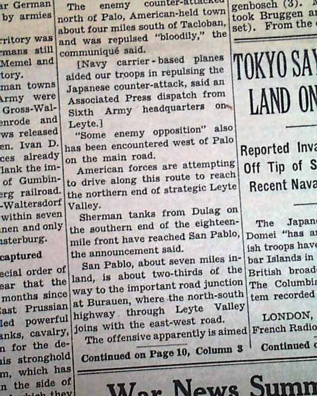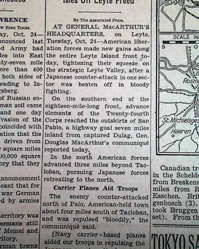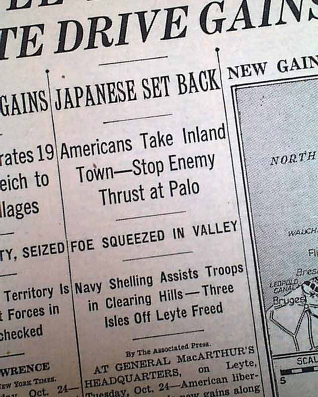 This 38 page newspaper has a three column headline on the front page: "LEYTE DRIVE GAINS" with subheads that include: "JAPANESE SET BACK" and more. Continues on page 10 with related maps. (see)