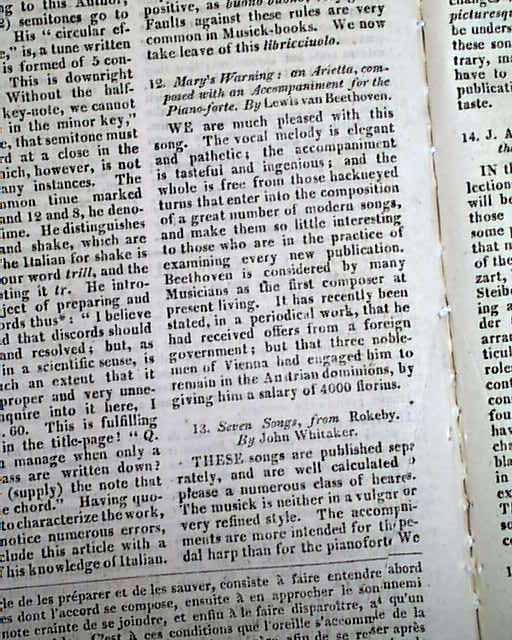 Under: "Review of New Musical Publications" is: "Mary's Warning: an Arietta, composed with an Accompaniment for the Piano-forte, By Lewis [sic] van Beethoven." The review includes: "We are much pleased with this song. The vocal melody is elegant & pathetic; the accompaniment is tasteful & ingenious...Beethoven is considered by many musicians as the first composer at present living. It has recently been stated...that he had received offers form a foreign government; but that three noblemen of Vienna had engaged him to remain in the Austrian dominions by giving him a salary of 4000 florins."