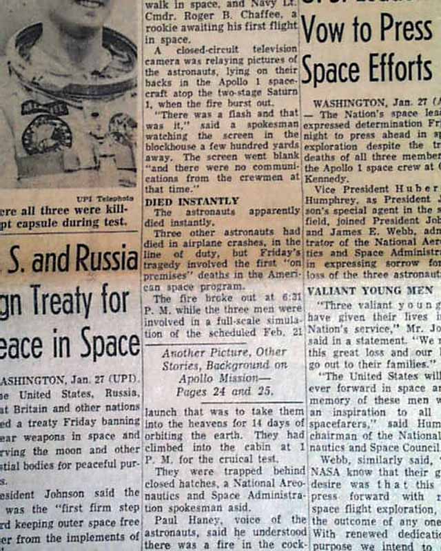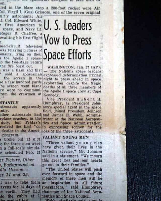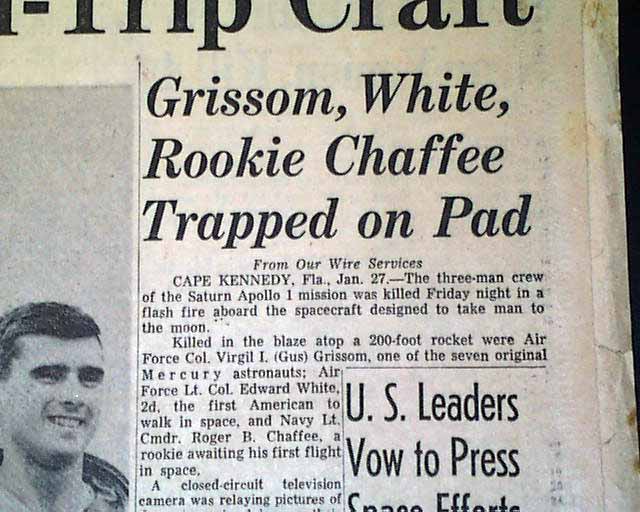 with subhead: "Grissom, White, Rookie Chaffee Trapped on Pad" and photo. (see)