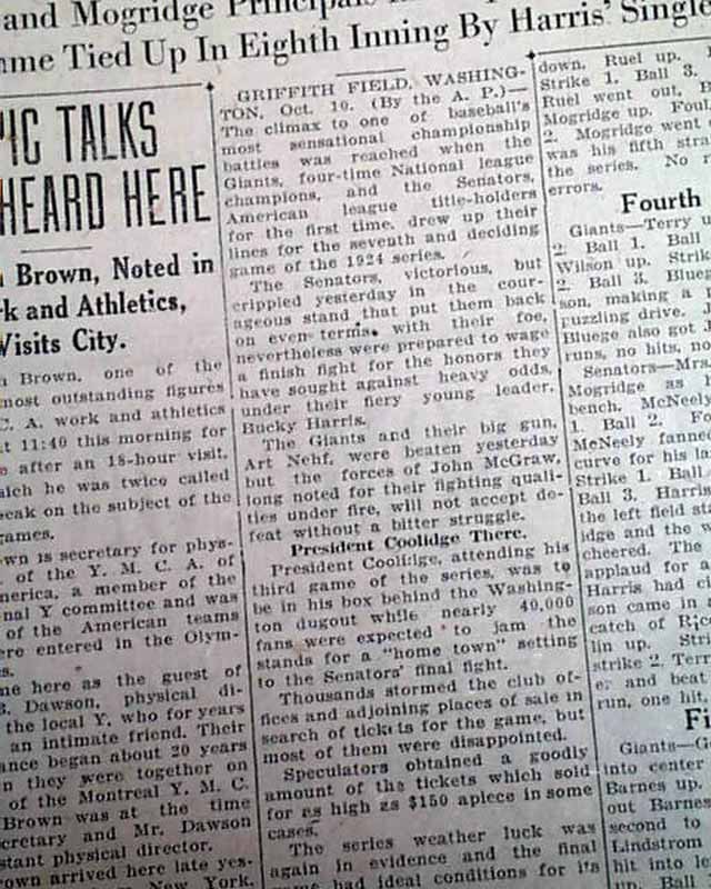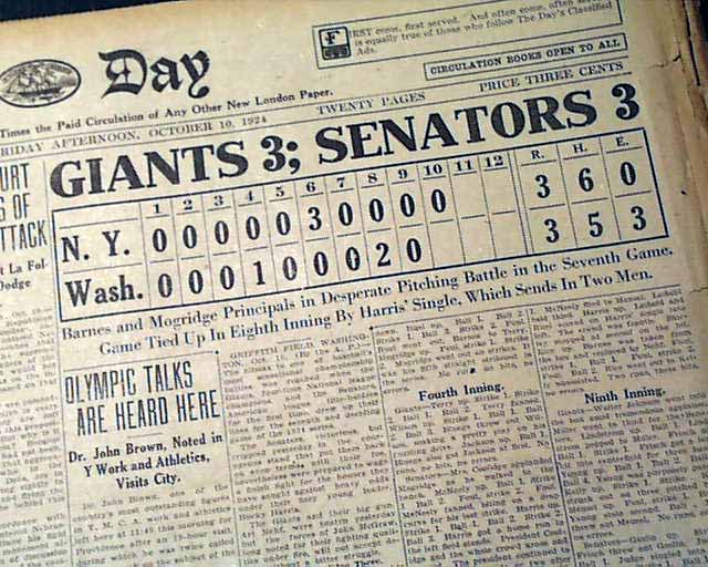 This 20 page newspaper has a four column headline on the front page: "GIANTS 3; SENATORS 3" with inning by inning reporting. Nice scoreboard graph as well. (see) Rare to have front page reporting while the game was still being played.