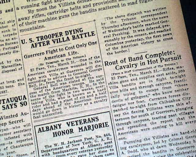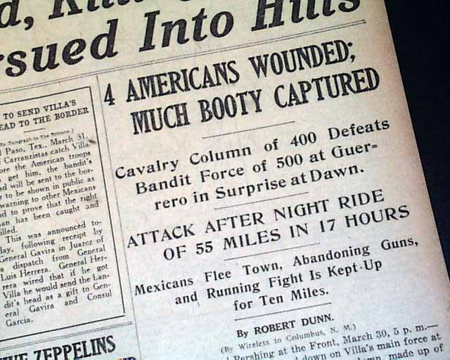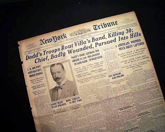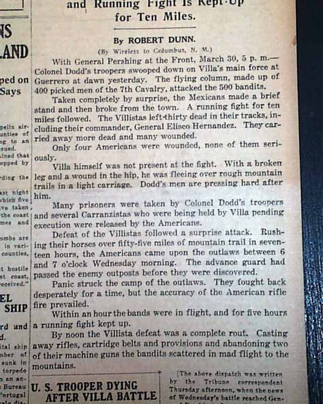 This 16 page newspaper has a nice two line banner headline on the front page: "Dodd's Troops Rout Villa's Band, Killing 30; Chief, Badly Wounded, Pursued Into Hills" with subheads. (see)