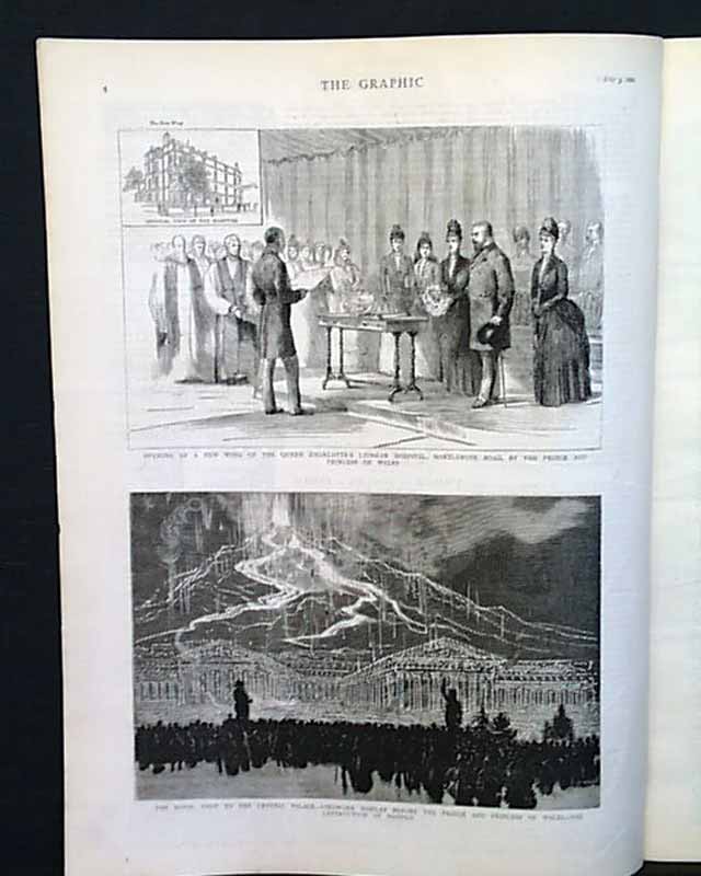 THE GRAPHIC, London, July 3, 1886 with Supplement. The front page features the illustration of the "Laying of the Foundation Stone of the People's Palace for East London by the Prince and Princess of Wales"; a half-page "The Royal Visit to the Crystal Palace - Firework Display Before the Prince and Princess of Wales - the Destruction of Pompeii"; a very nice, displayable double-page "Yachting on the Clyde"; "Fremasonry at Brighton - the Prince of Wales Installing the Duke of Connaught as Provincial Grand Master of Sussex"; a fullpage "A General View of Belfast, Ulster, the Chief Manufacturing City of Ireland" and many more illustrations, articles and advertisements.