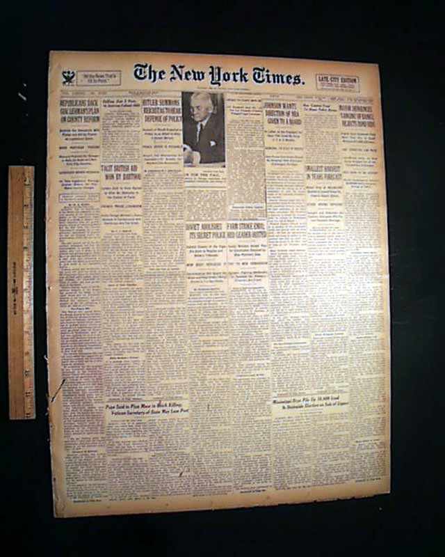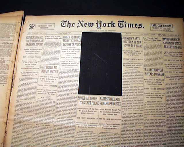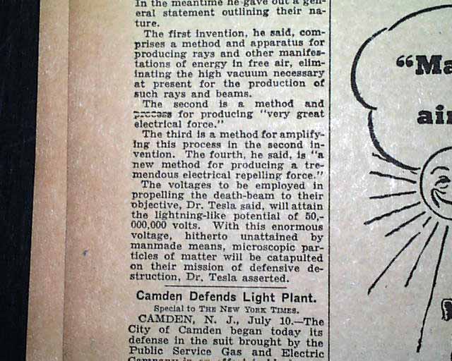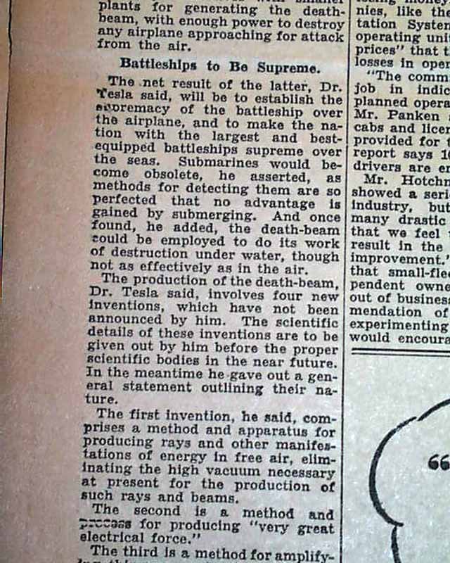 Other news of the day. This is a damaged issue as there are some various cut-outs throughout this issue with one on the front page (see photo) But the page with the Tesla report is untouched. Light browning.