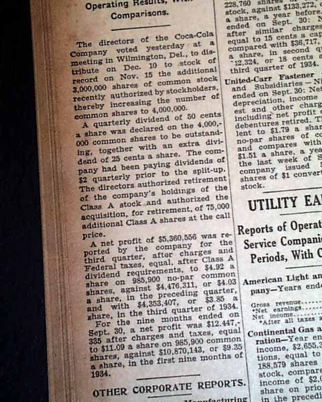 This 52 page newspaper has one column headlines on page 46: "COCA-COLA EXTRA ON 4,000,000 SHARES" and "25c Is Added to a Quarterly 50c on Company's New 4-to-1 Stock Split-Up". See photos for text here.