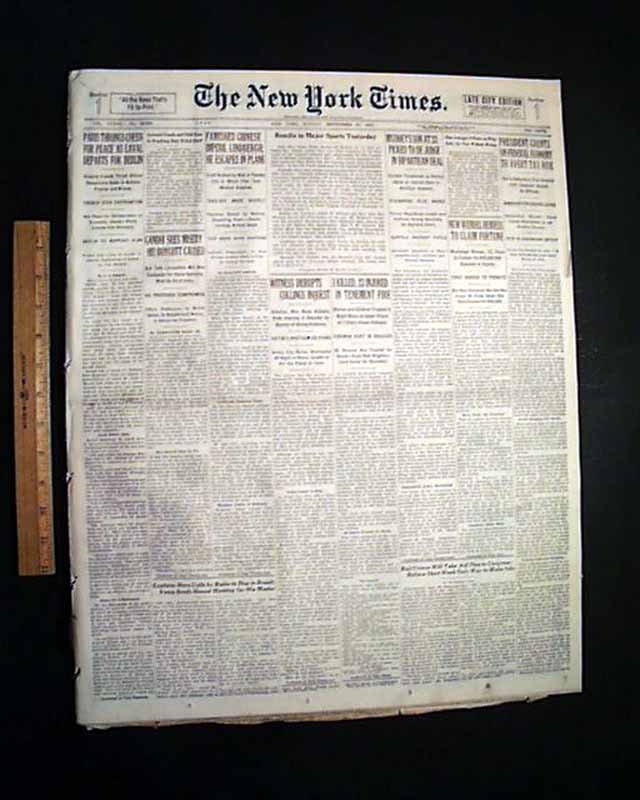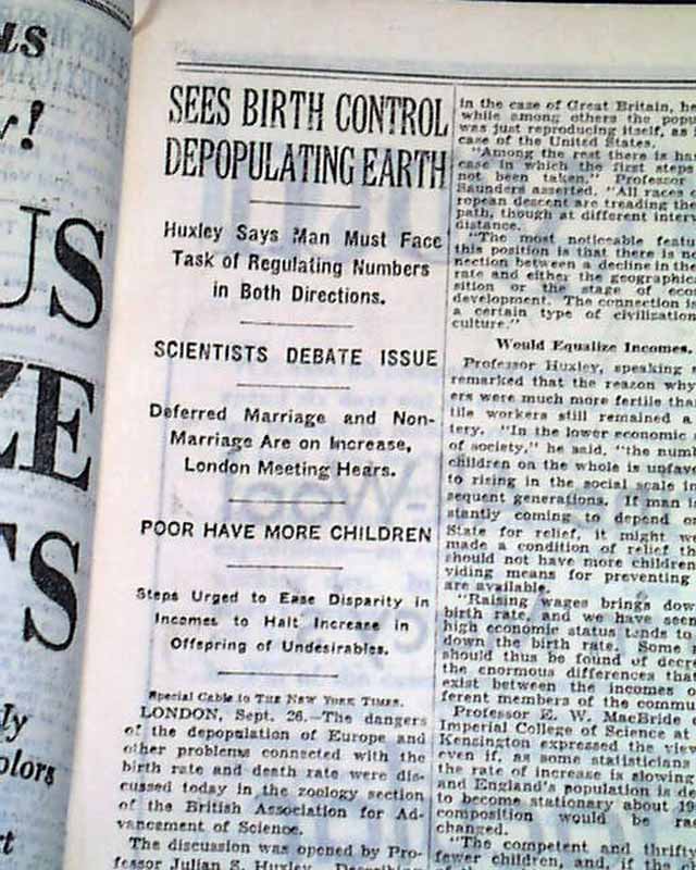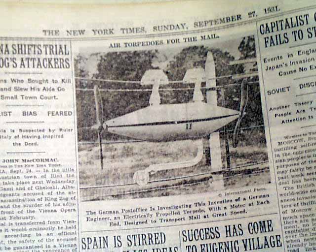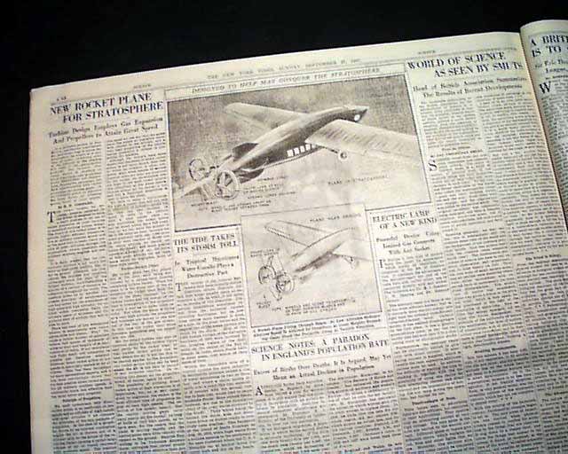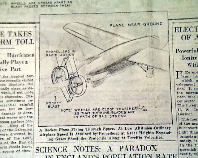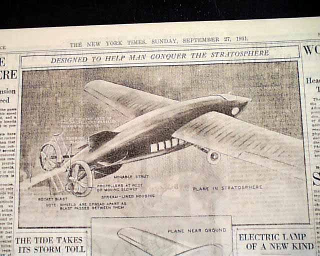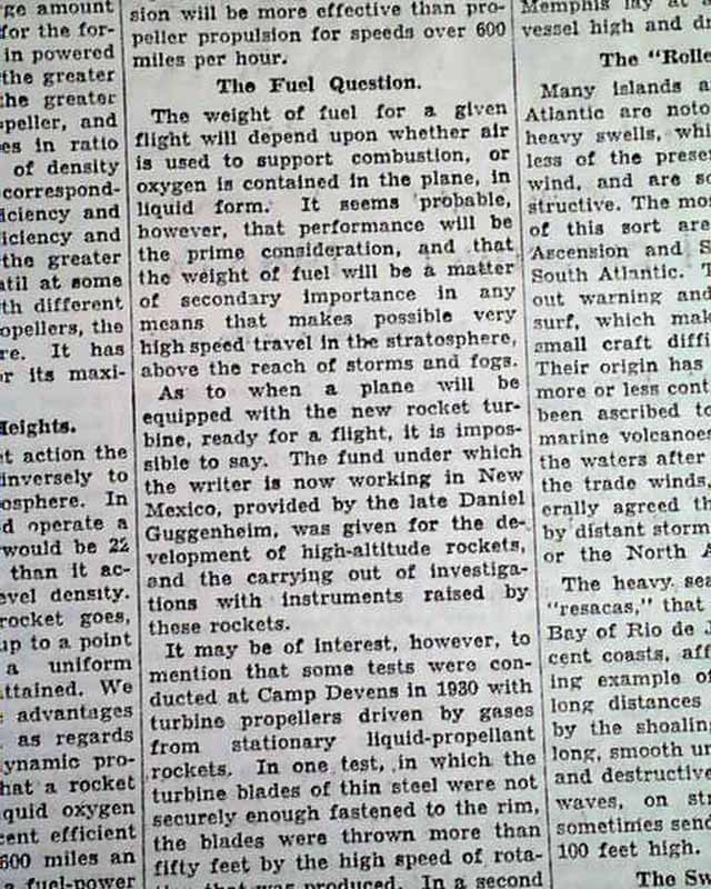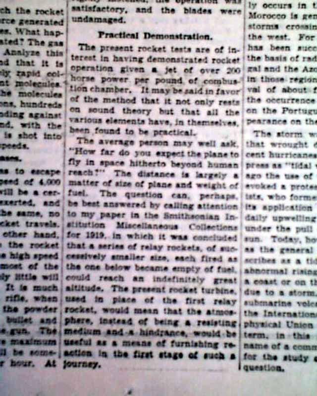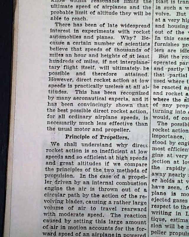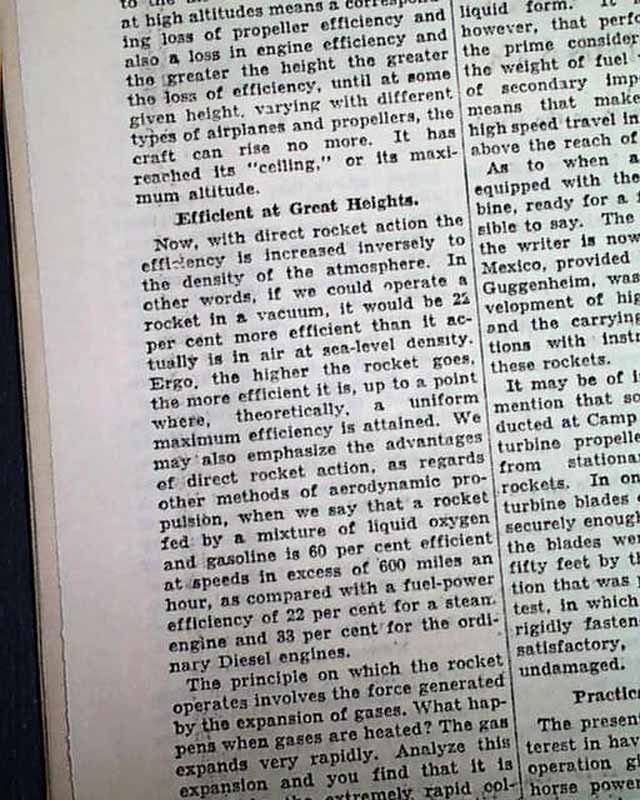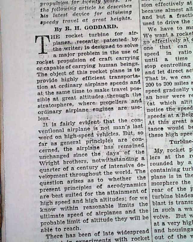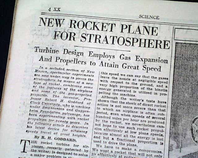 This 100+ page newspaper has great reporting on Professor Goddard's rocket airplane. Page XX4 (near back) has two column headlines that read: "NEW ROCKET PLANE FOR STRATOSPHERE," "Turbine Design Employs Gas Expansion And Propellers to Attain Great Speed" with two detailed illustration of his new invention (see images). Lengthy text here.