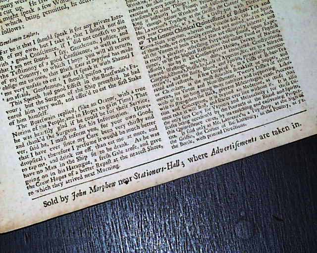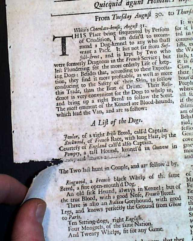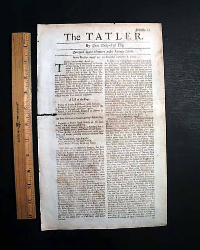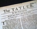 This newspaper was founded in 1709 by Richard Steele, who used the nom de plume "Isaac Bickerstaff, Esquire", the first such consistently adopted journalistic persona. Steele's idea was to publish the news and gossip heard in London coffeehouses, hence the title, leaving the subject of politics to the newspapers. To assure complete coverage of local gossip, a reporter was placed in each of the city's popular coffeehouses: accounts of manners and mores were datelined from White's; literary notes from Will’s; notes of antiquarian interest were dated from the Grecian Coffee House; and news items from St. James’s. It was published three times a week for less than two years, from April 12, 1709 to January 2, 1711. (credit Wikipedia).