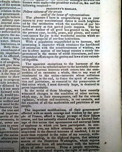 NILES' WEEKLY REGISTER, Baltimore, Dec. 11, 1830 The prime feature of this issue would be the complete printing of the very lengthy: "President's Message", being the annual state-of-the-union address of the President, a tradition which began with Washington and continues to this day. This very detailed & wordy address takes over 9 pages and is signed in type: Andrew Jackson.