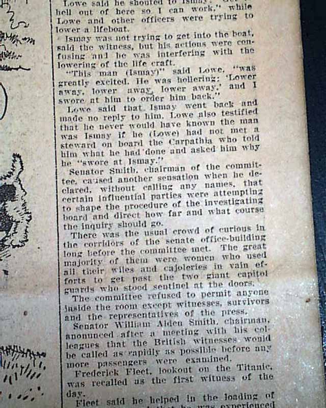 The front page headline notes: "J. BRUCE ISMAY WARNED TO GET BACK FROM LIFEBOAT" with one column subheads: "Fifth Officer Lowe of the Titanic's Crew Startles Senate Committee With Statement Heretofore Unrevealed", "Outside Influences At Work On Investigation?", "Senator Smith Calls No Names but Declares Certain Parties Are Attempting to Shape Committee's Procedure" and various related text. Ismay, the chief official of the White Star Line which owned the Titanic, was widely criticized for having survived the sinking while so many others died.