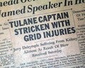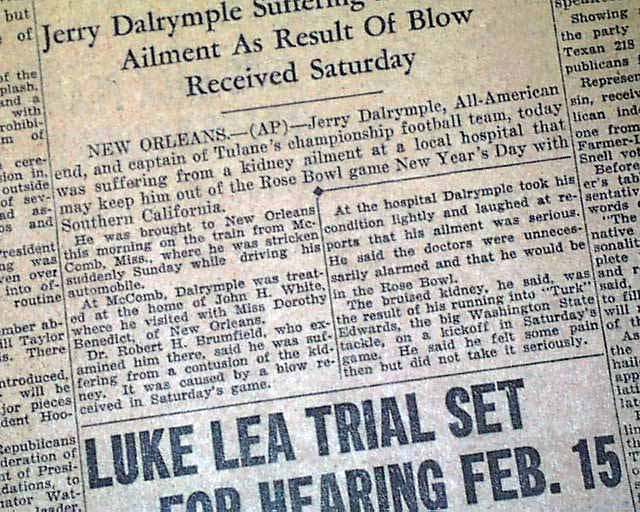 This 28 page newspaper has two column headlines on the front page: "TULANE CAPTAIN STRICKEN WITH INJURIES", "Jerry Dalrymple Suffering From Kidney Ailment As Result Of Blow Received Saturday". See photos for text. Nice to have this report on the front page.