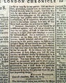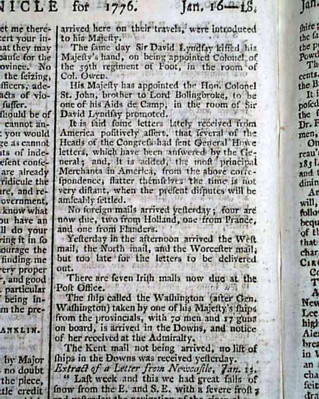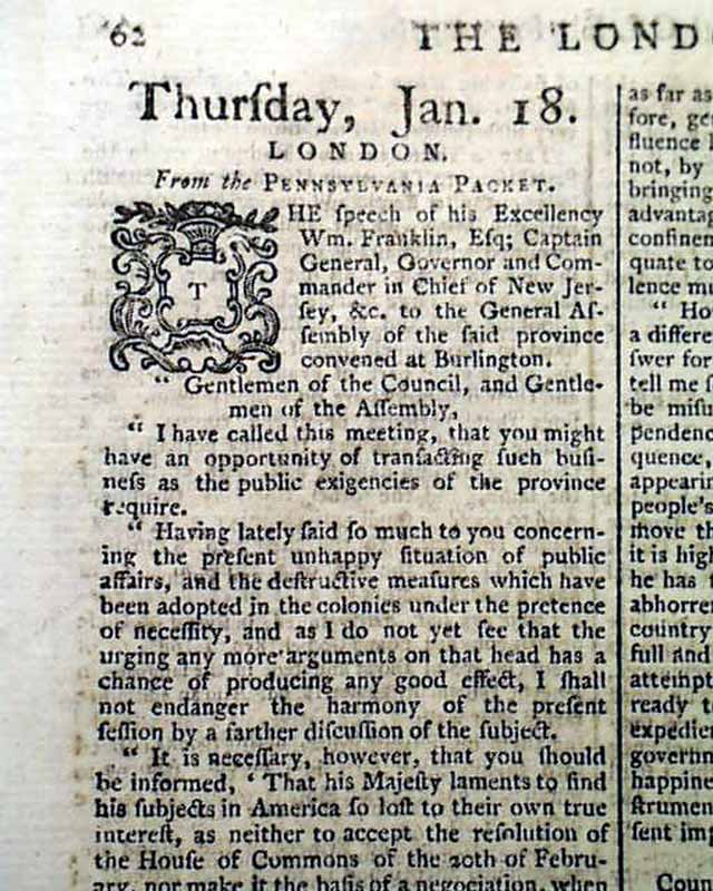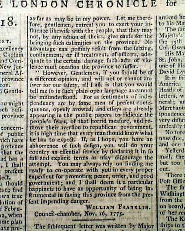 THE LONDON CHRONICLE, Jan. 18, 1776 Close to half a page is taken up with a speech by the governor of New Jersey, signed in type: William Franklin. As would be imagined, much of the message relates to the ongoing Revolutionary War (see). Franklin was a steadfast Loyalist during the Revolutionary War--evident in his speech--despite his father (Benjamin) being one of the most prominent patriots, a difference that tore the two apart. In 1782 William Franklin went into exile in Britain where he died in 1813.