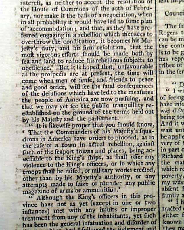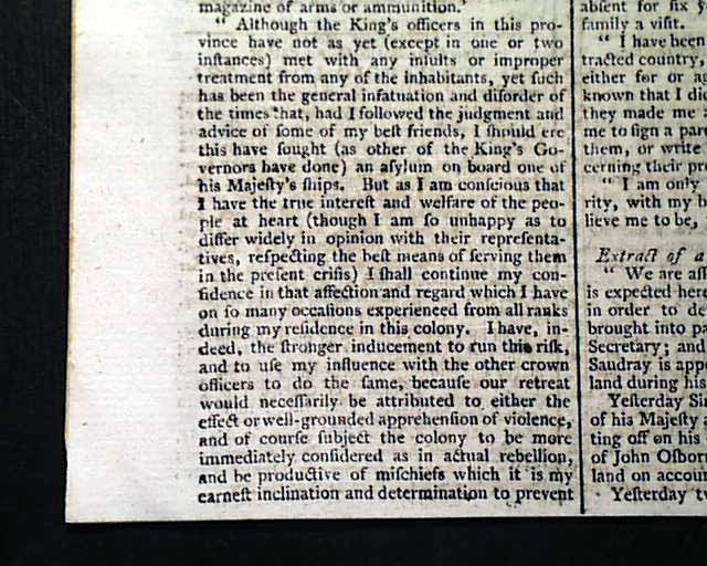 Bits of his speech printed here include: "...the present unhappy situation of public affairs, and the destructive measures which have been adopted in the colonies under the pretense of necessity...will see the fatal consequences of the delusions which have led to the measures the people of America are now pursuing..." and much more.