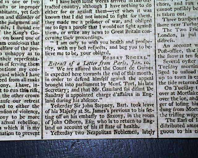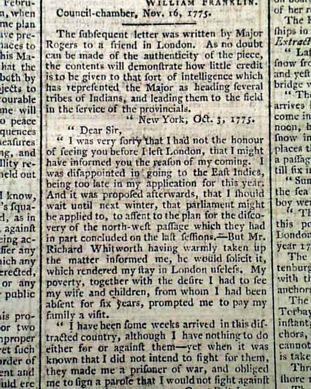 The same page also has a letter signed by Robert Rogers . which is prefaced with: "...written by Major Rogers...contents will demonstrate how little credit is to be given to that fort of intelligence which has represented the Major as heading several tribes of Indians & leading them to the field in the service of the provincials." dated at New York, Oct. 3, 1775 (see).