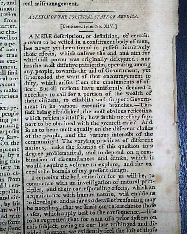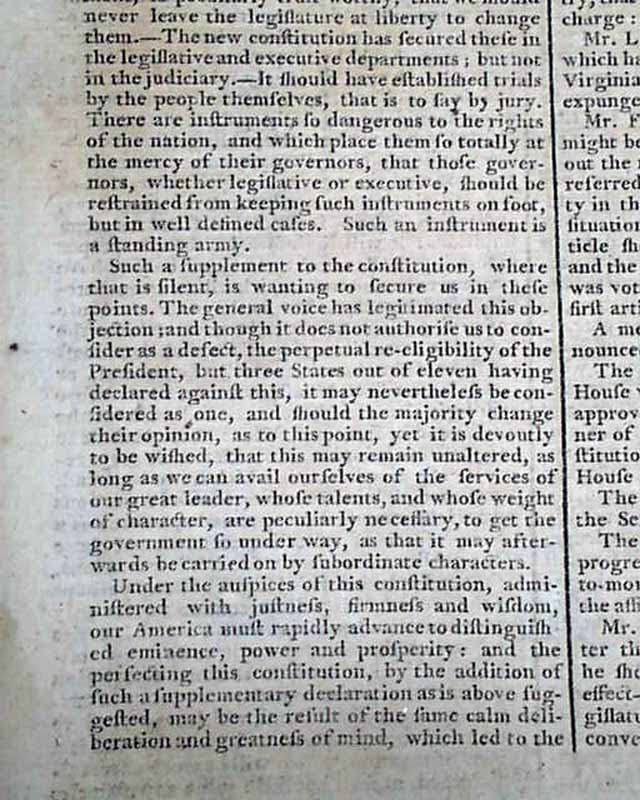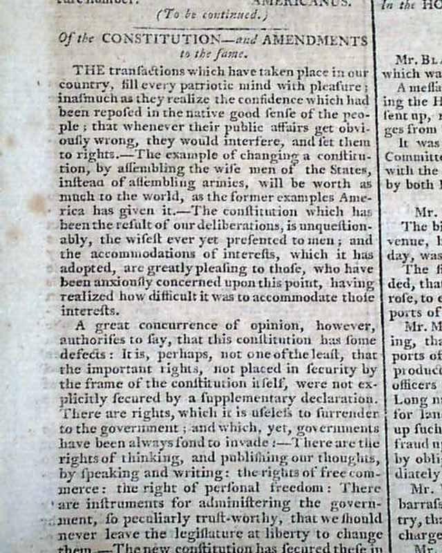 Page 2 has a very significant & interesting article headed: "Of the Constitution--and Amendments to the Same", which documents the need to amend the constitution to protect various rights. It includes in part: "...The constitution which has been the result of over deliberations, is unquestionably, the wisest ever yet presented to men...A great concurrence of opinion, however, authorizes to say that this constitution has some defects...that the important rights, not placed in security by the frame of the constitution itself, were not explicitly secured by a supplementary declaration. There are rights which it is useless to surrender to the government...Such a supplement to the constitution, where that is silent, is wanting to secure us in these points..." with more (see).