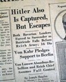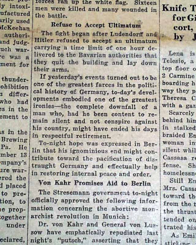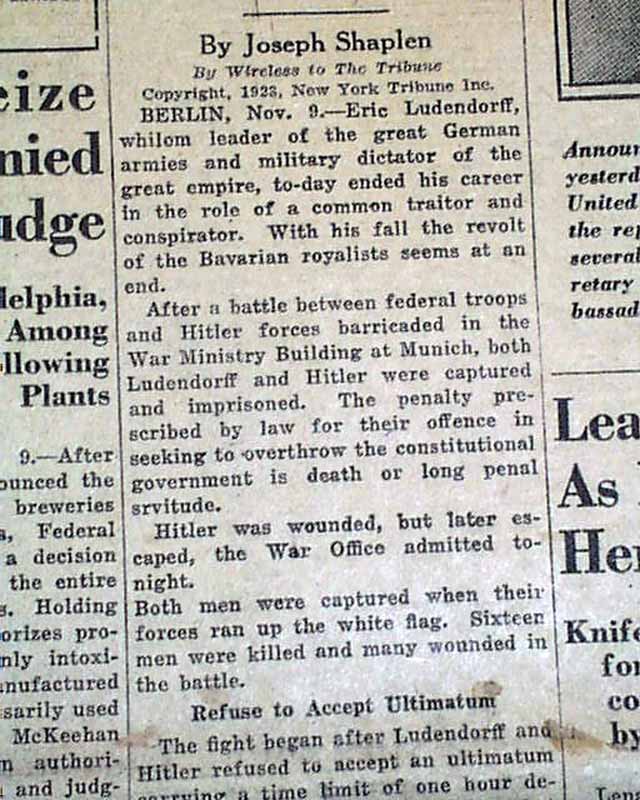 This 20 page newspaper has a banner headline on the front page: "Ludendorff Imprisoned as Royalist Revolt Is Crushed" with subheads that include: "Hitler Also Is Captured, But Escapes"