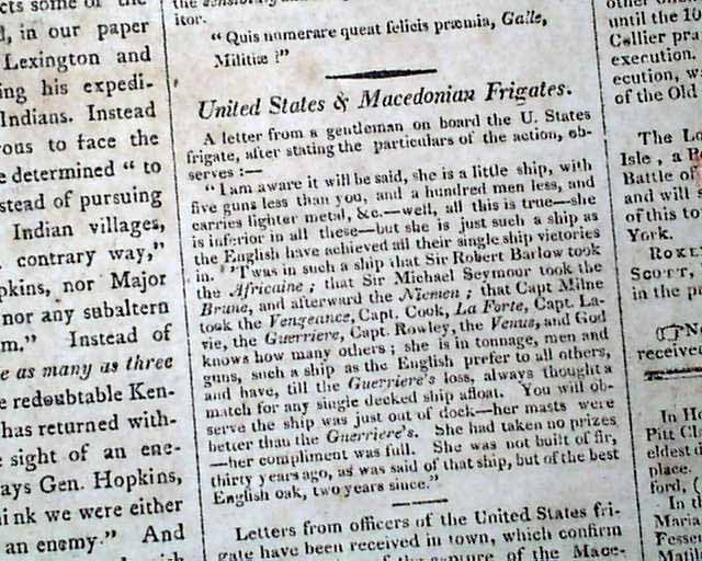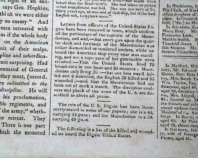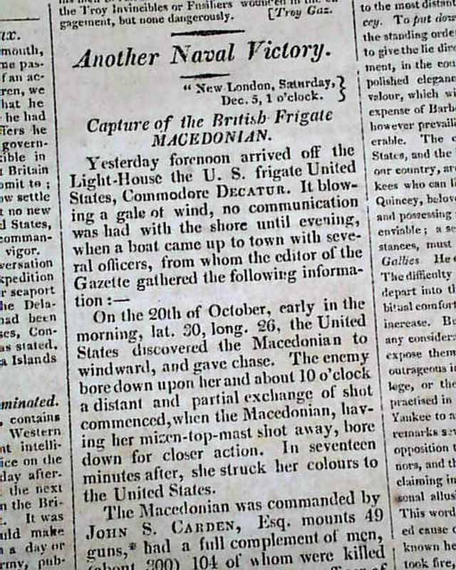 Pages 1 & 2 have much on the military events in Europe. Page 3 has: "United States & Macedonian Frigates" which is an article concerning this famous naval battle (see). Plus, the back page has more with: "Another Naval Victory - Capture of the British Frigate Macedonian". Also: "The Armistice of the Niagara Terminated" "From Halifax" "Army Of The Right" and a few other war-related items.