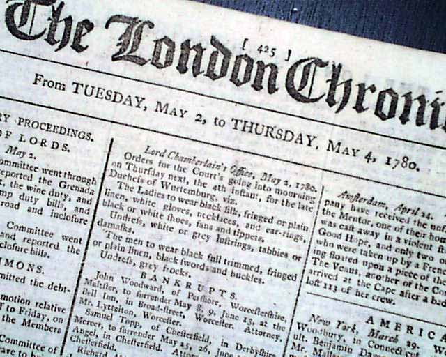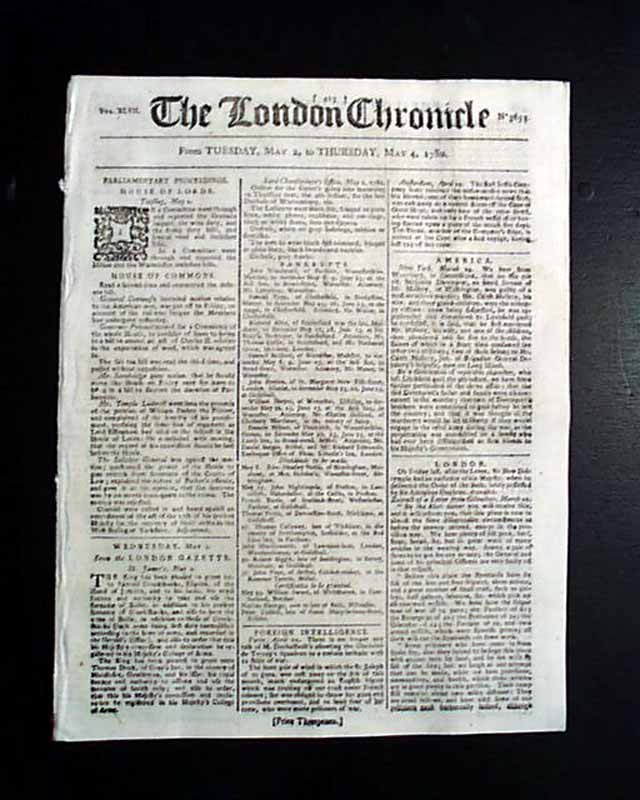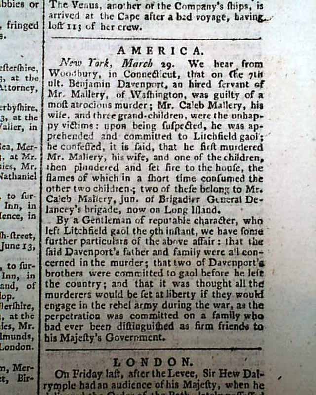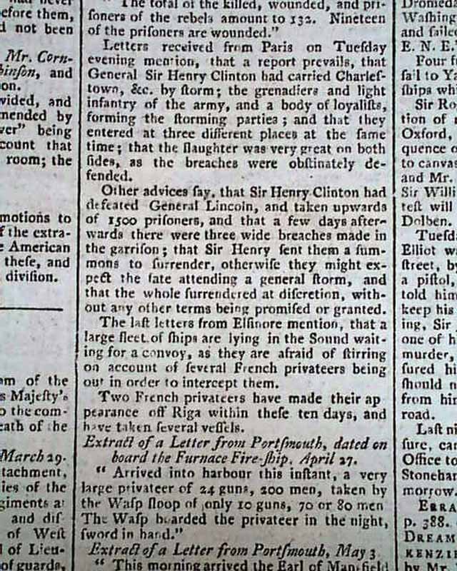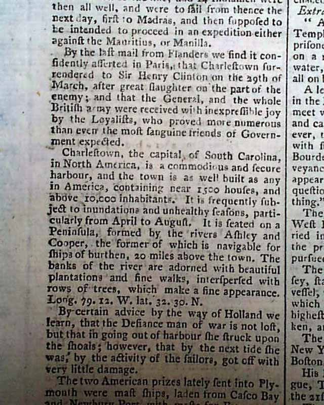 The front page has a report from New York headed: "America" concerning a murder in Connecticut (see). Page 2 include: "...that Charlestown [Charleston] surrendered to Sir Henry Clinton on the 29th of March after great slaughter on the part of the enemy; & that the general & the whole British army were received with inexpressible joy by the Loyalists who proved more numerous than ever the most sanguine friends of government expected. Charlestown, the capital of South Carolina...is a commodious & secure harbour & the town is as well built as any in America..." with more descriptive text on Charleston (see). The surrender report is actually premature: Charleston did not surrender until May 12.
