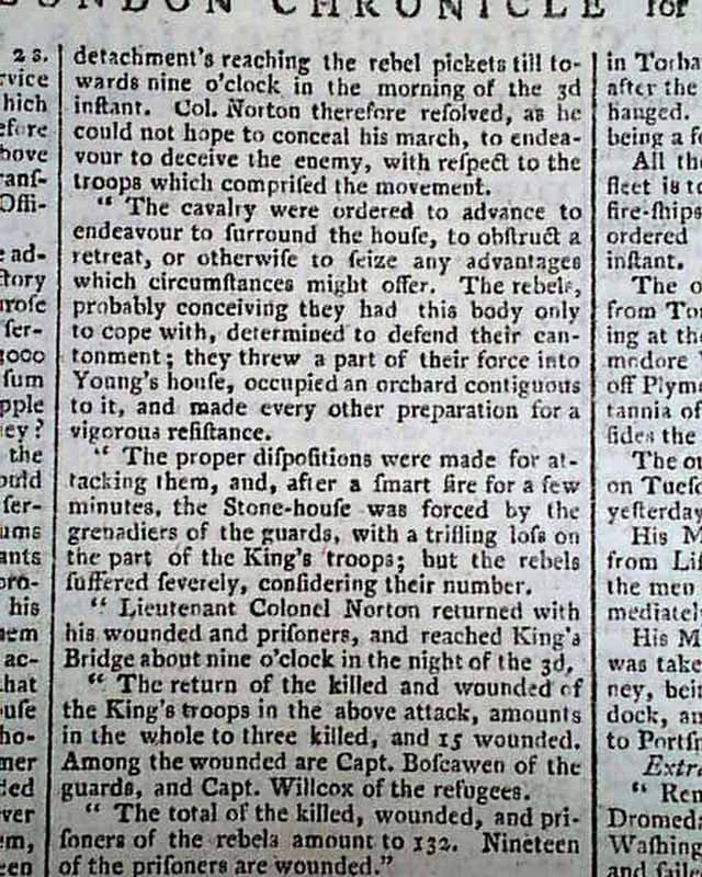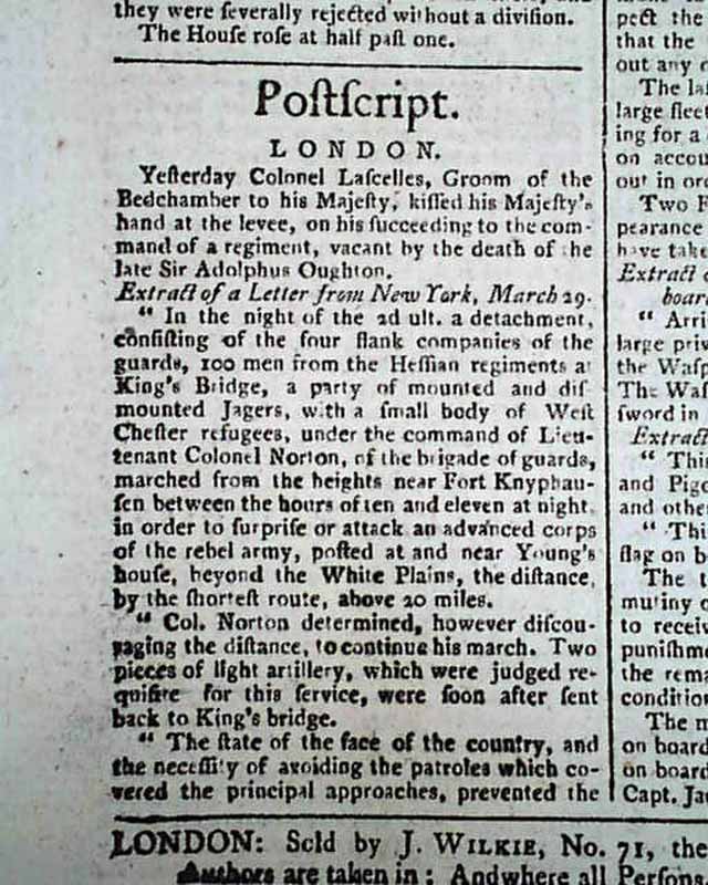 The back page has a letter from New York with much news on the battle of Young's House including: "...a detachment...of the four flank companies of the guards, 100 men from the Hessian regiments at King's Bridge...marched from the height near Fort Knyphausen...in order to surprise or attack an advanced corps of the rebel army...beyond the White Plains...The cavalry were ordered to advance to endeavour to surround the house to obstruct a retreat..." with more on this battle during which the British attacked & destroyed an American outpost in Westchester County just above New York City. See the hyperlink for more on the battle.