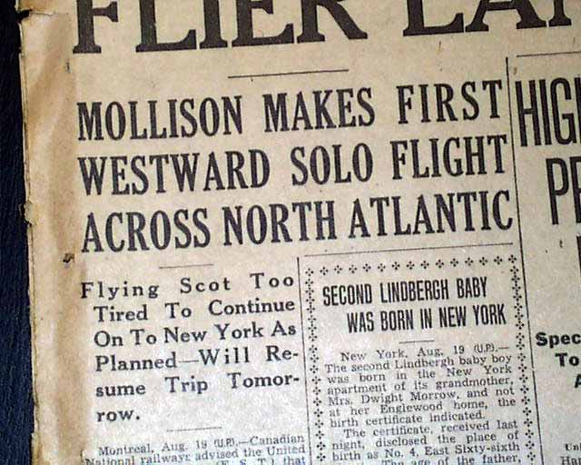 This 24 page newspaper has a nice banner headline on the front page: "FLIER LANDS AFTER OCEAN HOP" with subheads that include: "Mollison Makes First Westward Solo Flight Across North Atlantic" and more. 1st report coverage on the first solo flight across the Atlantic Ocean from West to East. This is considered harder to do because your flying against the jet stream.