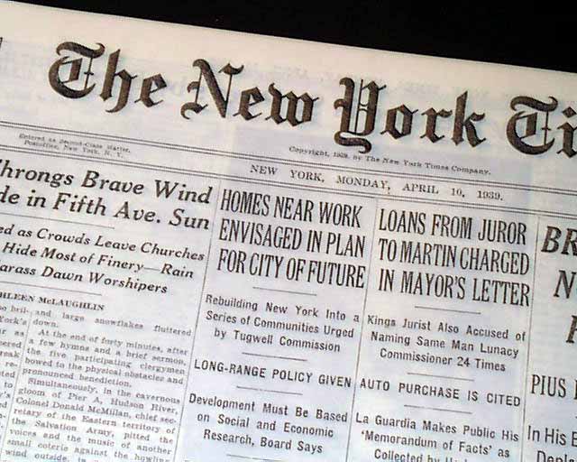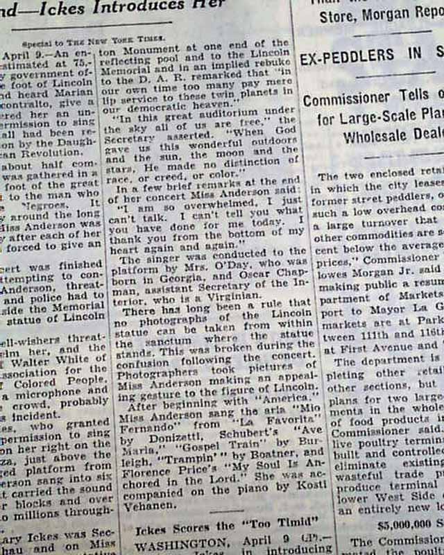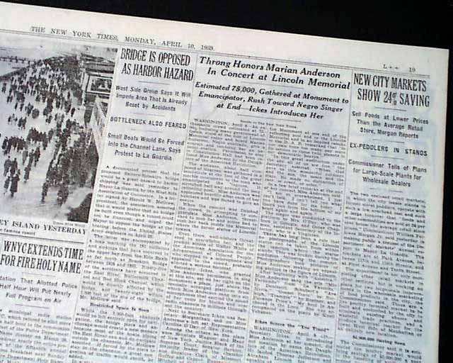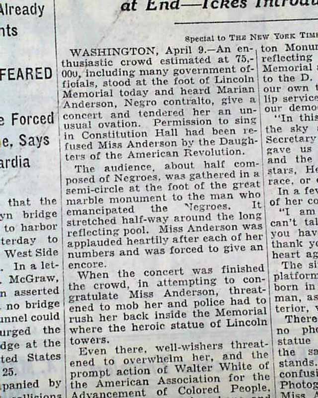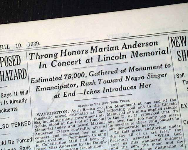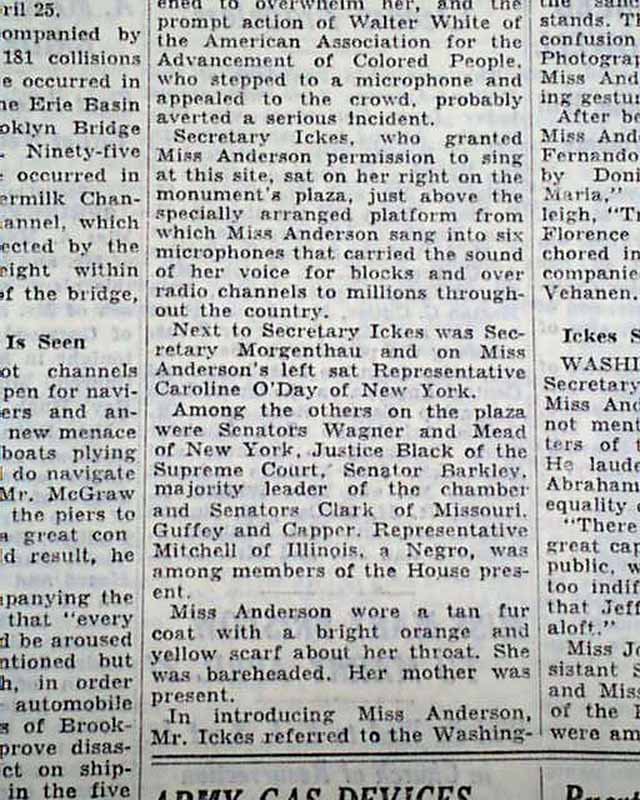 This 36 page newspaper has two column headlines on page 19: "Throng Honors Marian Anderson In Concert at Lincoln Memorial", "Estimated 75,000, Gathered at Monument to Emancipator, Rush Toward Negro Singer at End--Ickes Introduces Her" with about 2/3 of a column of text. Other news, sports and advertisements of the day throughout. Rag edition in great condition.