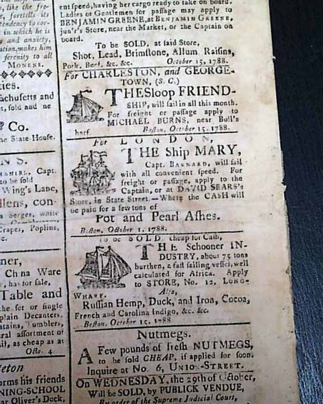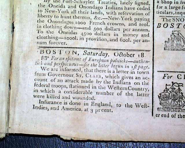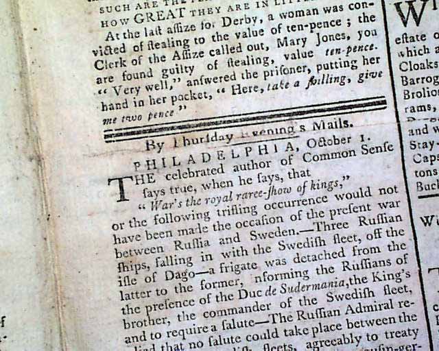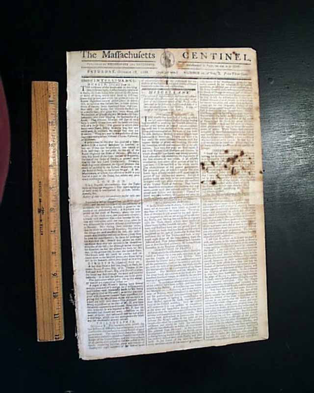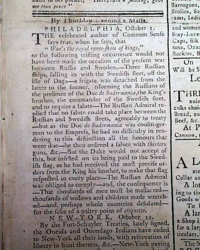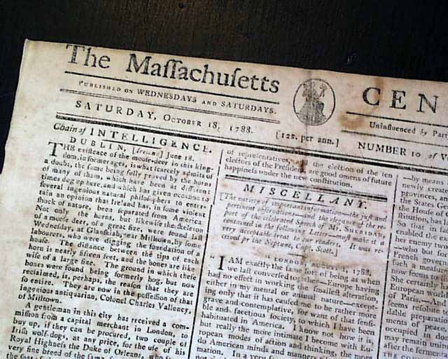THE MASSACHUSETTS CENTINEL, Boston, Oct. 18, 1788 Page 3 has an item from Philadelphia beginning; "The celebrated author of Common Sense says true when he says that..." (see). Also a report from New York concerning treaties with the Indians, plus a letter from Gov. St. Clair concerning an attack by Indians upon the federal troops.