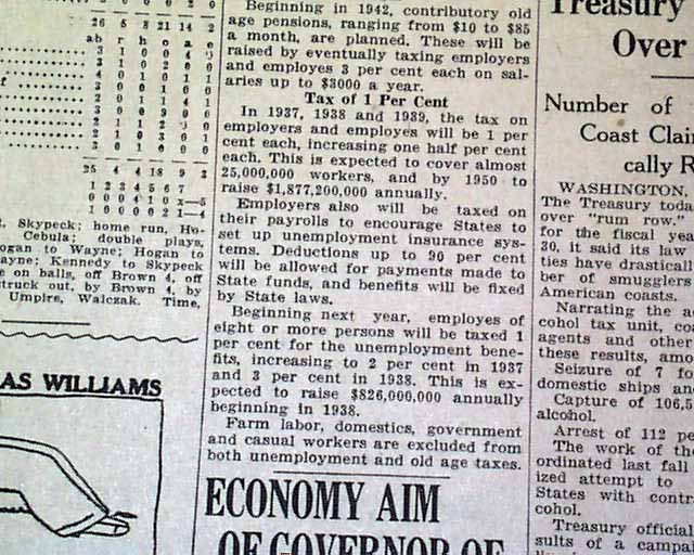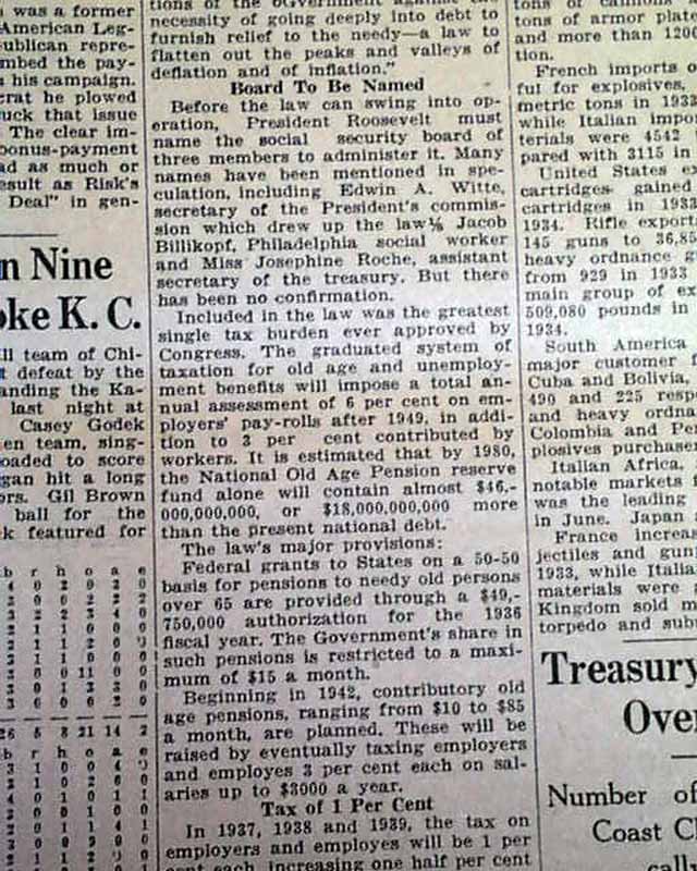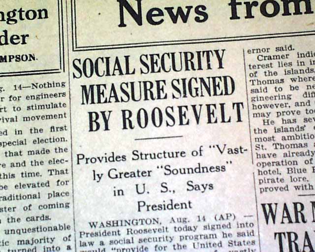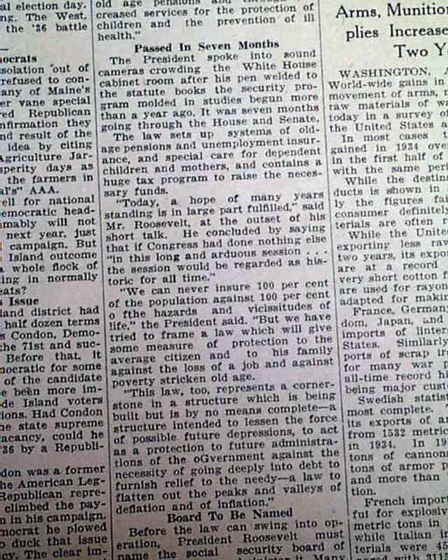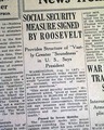 1st report coverage on President Roosevelt signing the Social Security Bill into law.