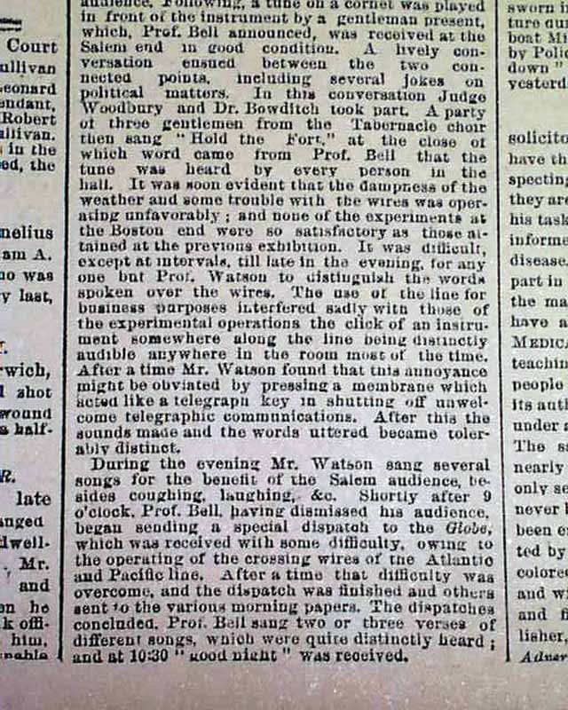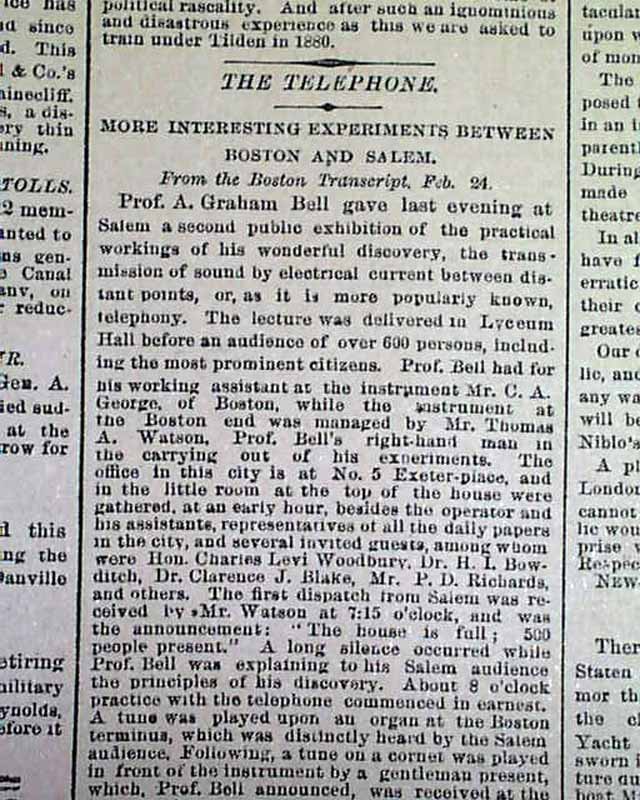 Coverage on telephone experiments between Alexander Graham Bell and Thomas A. Watson.