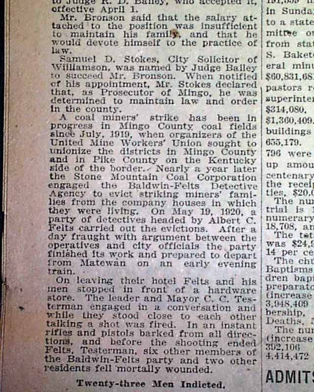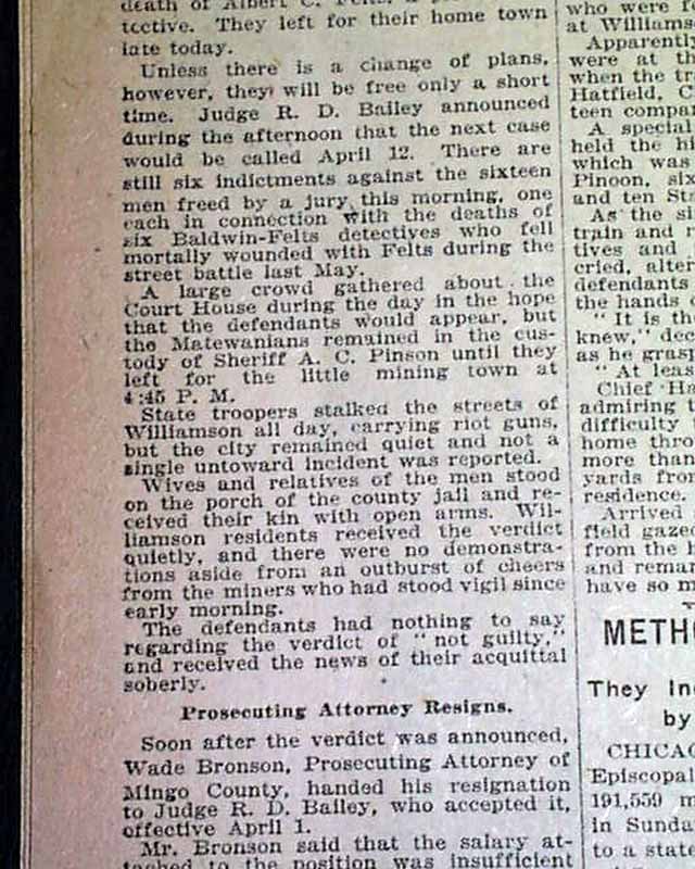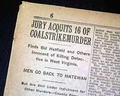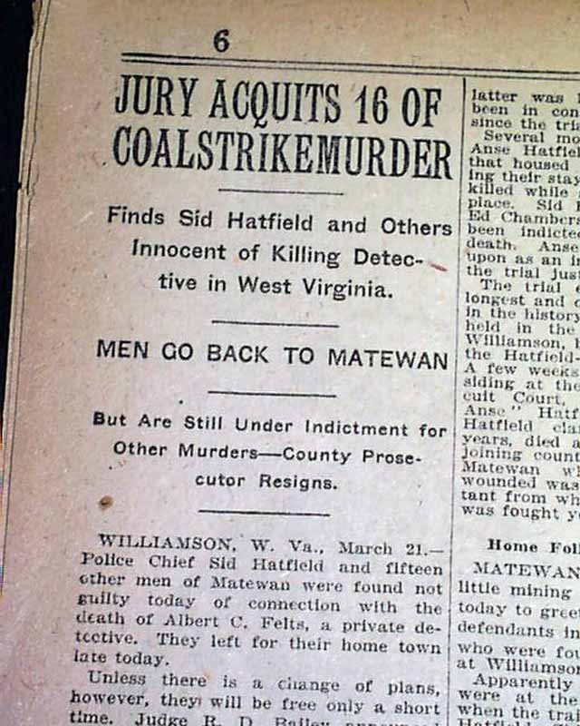 This 36 page newspaper has one column headings on page 6: "JURY ACQUITS 16 OF COALSTRIKEMURDER (sic)", "Finds Sid Hatfield and Others Innocent of Killing Detectives in West Virginia", "Men Go Back To Matewan" and more. 1st report coverage on the acquittal of William Sidney 'Sid' Hatfield, police chief of Matewan, and others in West Virginia. He would be killed in a shootout later that year.