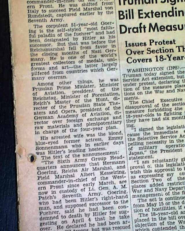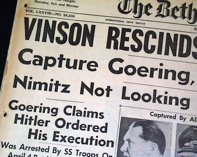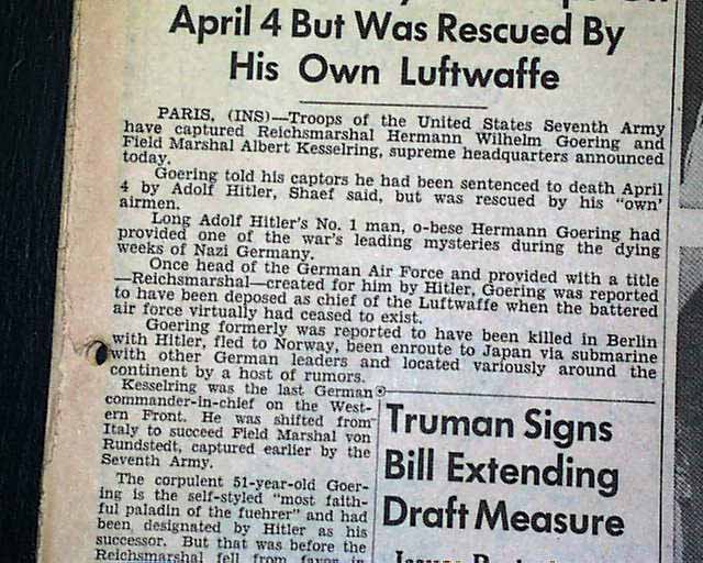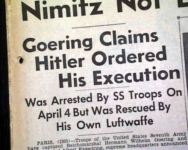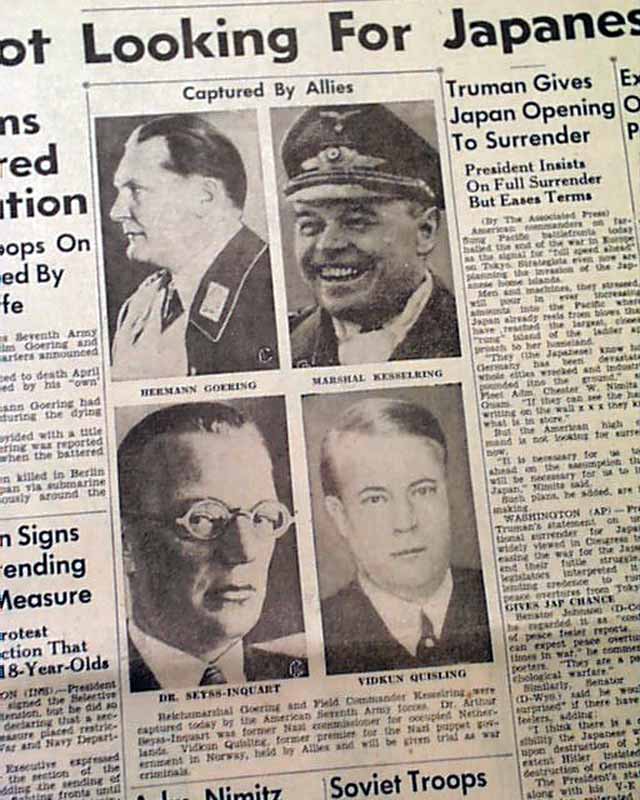 This 22 page newspaper has a banner headline on the front page: "Capture Goering, Kesselring and Quisling" with subheads that include: "Goering Claims Hitler Ordered His Execution" and more with photos of the captured Nazis.