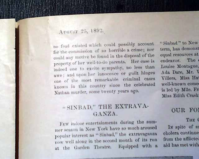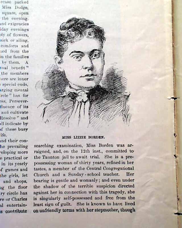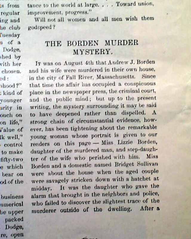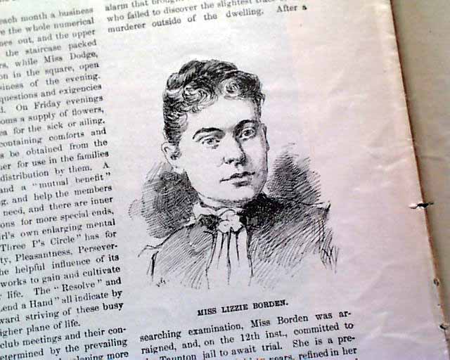 Inside has an article headed: "The Borden Murder Mystery" which begins: "It was on August 4th that Andrew J. Borden and his wife were murdered in their own house in the city of Fall River, Massachusetts..." with more, mentioning that their daughter is suspected to have done the murders (see). Included is a print captioned: "Miss Lizzie Borden". This is early in the infamous Lizzie Borden murder case.
