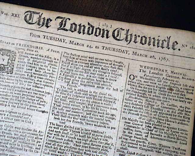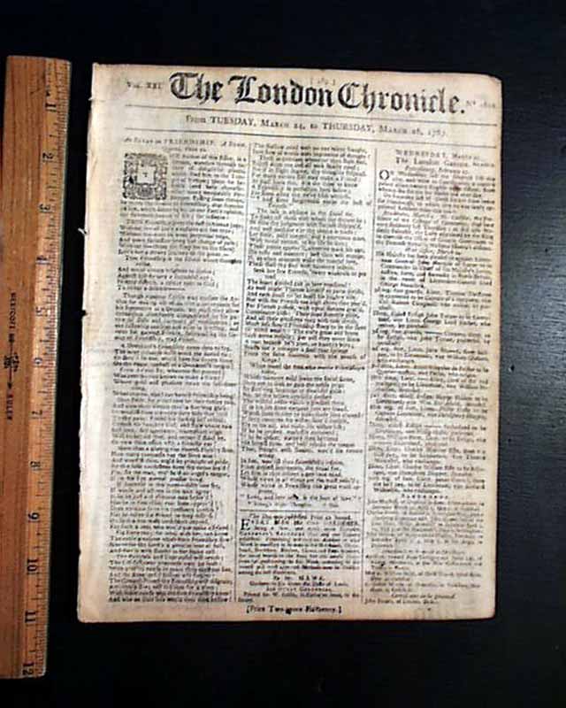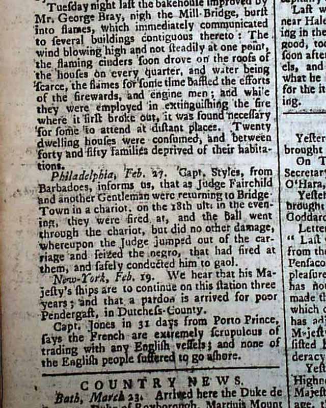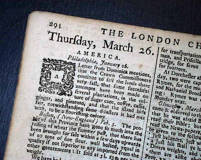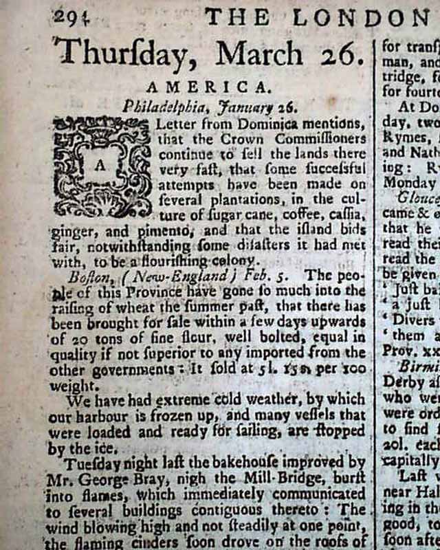 Inside has two-thirds of a column headed: "America" with reports from Philadelphia and Boston (see). Eight pages, 8 1/4 by 11 inches, nice condition.