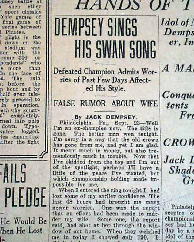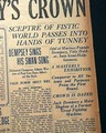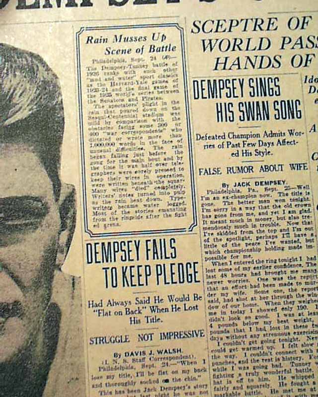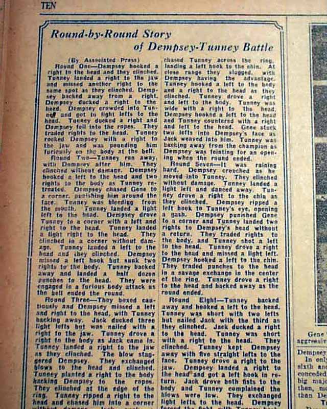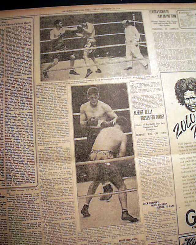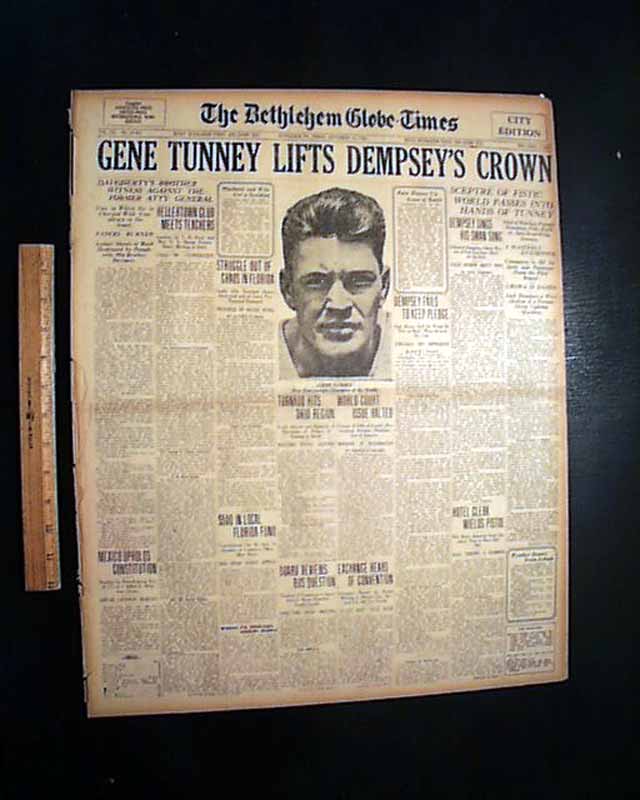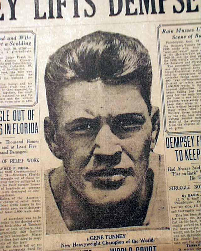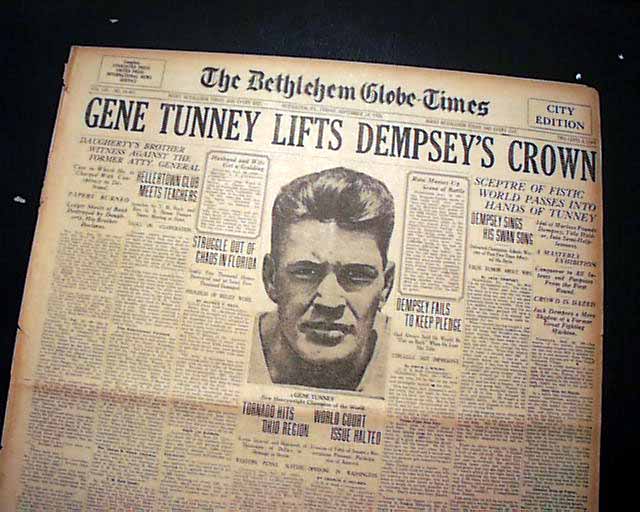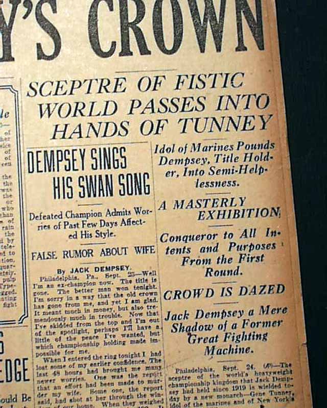 The front page has a great banner headline that proclaims: "GENE TUNNEY LIFTS DEMPSEY'S CROWN" with subheads and nice photo of Tunney (see photos). 1st report coverage on Gene Tunney winning the heavyweight boxing title from Jack Dempsey.